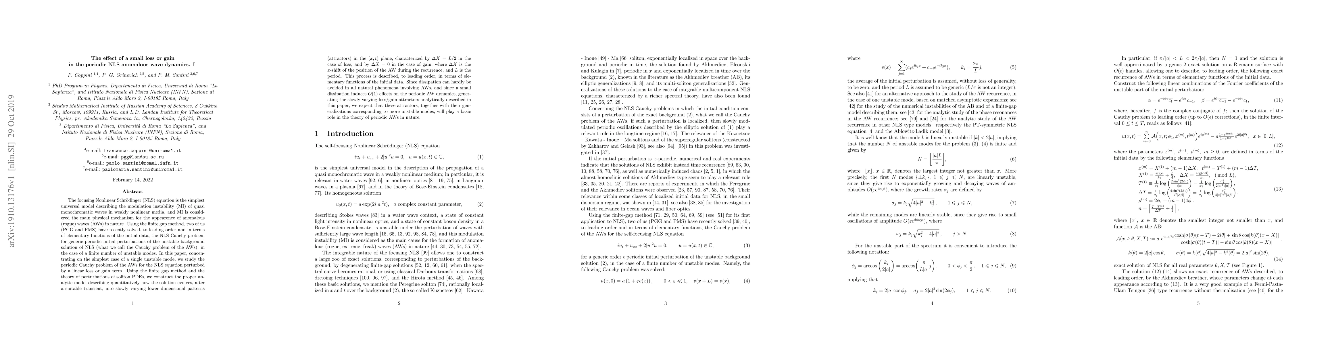 The focusing Nonlinear Schr\"odinger (NLS) equation is the simplest universal model describing the modulation instability (MI) of quasi monochromatic waves in weakly nonlinear media, and MI is considered the main physical mechanism for the appearence of anomalous (rogue) waves (AWs) in nature. Using the finite gap method, two of us (PGG and PMS) have recently solved, to leading order and in terms of elementary functions of the initial data, the NLS Cauchy problem for generic periodic initial perturbations of the unstable background solution of NLS (what we call the Cauchy problem of the AWs), in the case of a finite number of unstable modes. In this paper, concentrating on the simplest case of a single unstable mode, we study the periodic Cauchy problem of the AWs for the NLS equation perturbed by a linear loss or gain term. Using the finite gap method and the theory of perturbations of soliton PDEs, we construct the proper analytic model describing quantitatively how the solution evolves, after a suitable transient, into slowly varying lower dimensional patterns (attractors) in the $(x,t)$ plane, characterized by $\Delta X=L/2$ in the case of loss, and by $\Delta X=0$ in the case of gain, where $\Delta X$ is the $x$-shift of the position of the AW during the recurrence, and $L$ is the period. This process is described, to leading order, in terms of elementary functions of the initial data. Since dissipation can hardly be avoided in all natural phenomena involving AWs, and since a small dissipation induces $O(1)$ effects on the periodic AW dynamics, generating the slowly varying loss/gain attractors analytically described in this paper, we expect that these attractors, together with their generalizations corresponding to more unstable modes, will play a basic role in the theory of periodic AWs in nature.