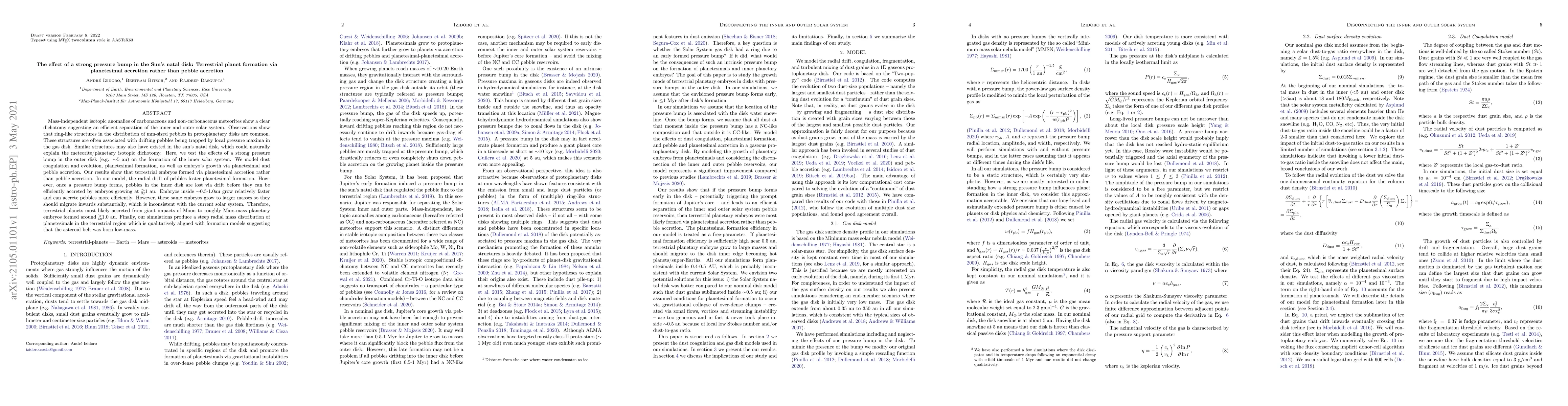 This paper investigates the impact of a strong pressure bump in the Sun's natal disk on terrestrial planet formation, finding that planetesimal accretion, rather than pebble accretion, is the dominant process. The model suggests that terrestrial planets formed via giant impacts of embryos formed beyond 1 AU, aligning with the observed isotopic dichotomy in meteorites.