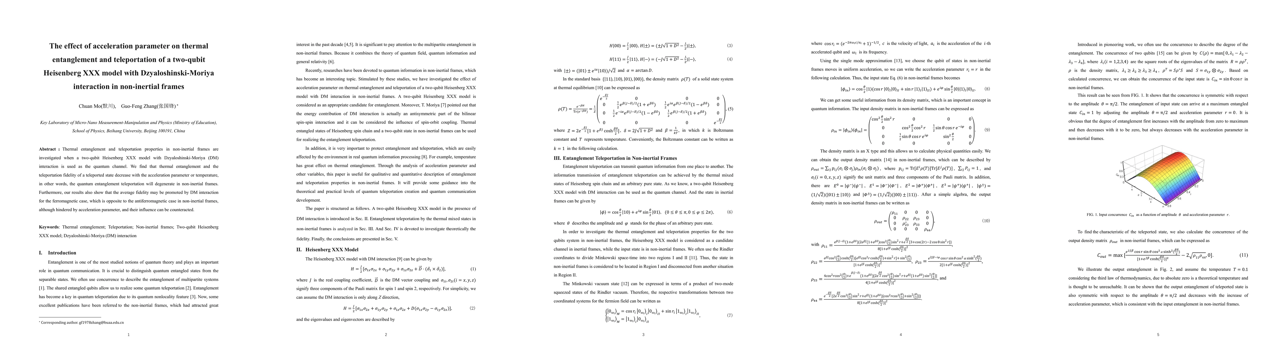 This paper examines how acceleration affects thermal entanglement and teleportation in a two-qubit Heisenberg XXX model with Dzyaloshinski-Moriya interaction in non-inertial frames. It finds that both entanglement and teleportation fidelity degrade with increasing acceleration or temperature, but Dzyaloshinski-Moriya interaction can enhance fidelity in ferromagnetic cases, though this effect is also diminished by acceleration.