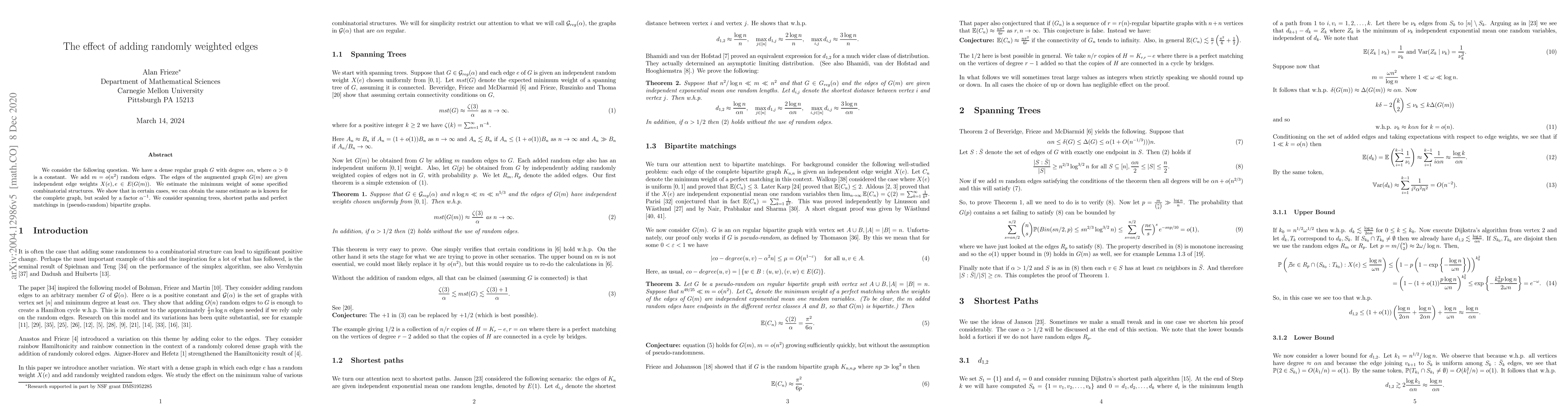 The paper considers a dense regular graph G with degree αn, adding m = o(n^2) random edges and assigning independent edge weights X(e) to the augmented graph G(m). It examines spanning trees, shortest paths, and perfect matchings in pseudo-random bipartite graphs.
