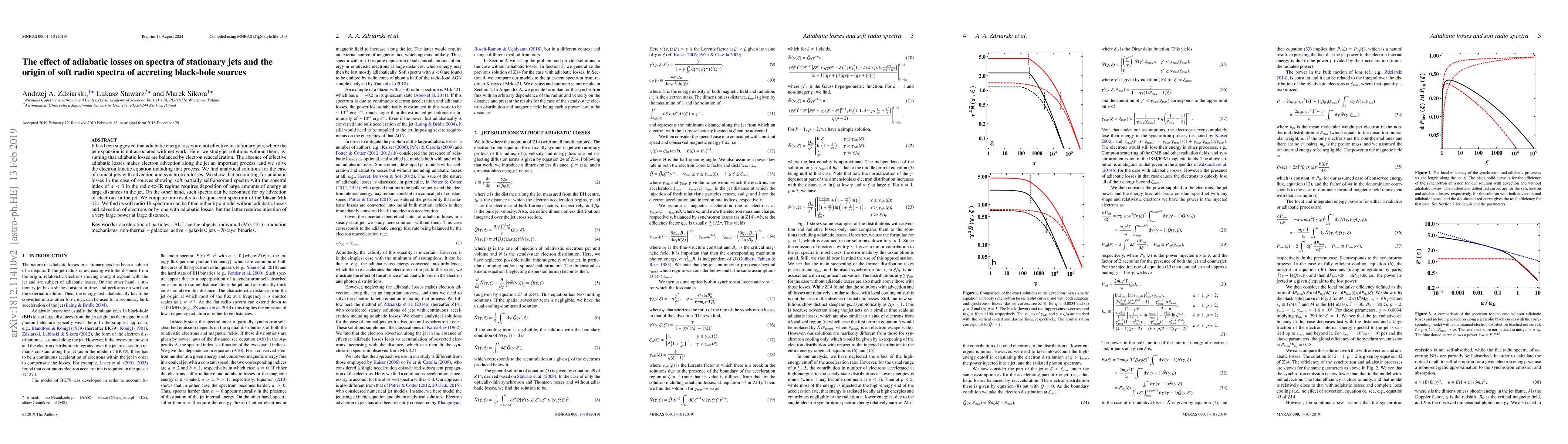 It has been suggested that adiabatic energy losses are not effective in stationary jets, where the jet expansion is not associated with net work. Here, we study jet solutions without them, assuming that adiabatic losses are balanced by electron reacceleration. The absence of effective adiabatic losses makes electron advection along the jet an important process, and we solve the electron kinetic equation including that process. We find analytical solutions for the case of conical jets with advection and synchrotron losses. We show that accounting for adiabatic losses in the case of sources showing soft partially self-absorbed spectra with the spectral index of $\alpha<0$ in the radio-to-IR regime requires deposition of large amounts of energy at large distances in the jet. On the other hand, such spectra can be accounted for by advection of electrons in the jet. We compare our results to the quiescent spectrum of the blazar Mrk 421. We find its soft radio-IR spectrum can be fitted either by a model without adiabatic losses and advection of electrons or by one with adiabatic losses, but the latter requires injection of a very large power at large distances.