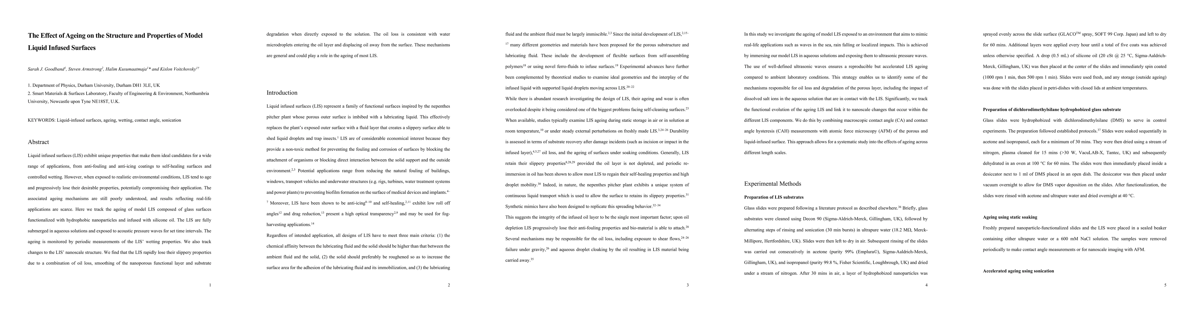 Liquid infused surfaces (LIS) exhibit unique properties that make them ideal candidates for a wide range of applications, from anti-fouling and anti-icing coatings to self-healing surfaces and controlled wetting. However, when exposed to realistic environmental conditions, LIS tend to age and progressively lose their desirable properties, potentially compromising their application. The associated ageing mechanisms are still poorly understood, and results reflecting real-life applications are scarce. Here we track the ageing of model LIS composed of glass surfaces functionalized with hydrophobic nanoparticles and infused with silicone oil. The LIS are fully submerged in aqueous solutions and exposed to acoustic pressure waves for set time intervals. The ageing is monitored by periodic measurements of the LIS' wetting properties. We also track changes to the LIS' nanoscale structure. We find that the LIS rapidly lose their slippery properties due to a combination of oil loss, smoothing of the nanoporous functional layer and substrate degradation when directly exposed to the solution. The oil loss is consistent with water microdroplets entering the oil layer and displacing oil away from the surface. These mechanisms are general and could play a role in the ageing of most LIS.
