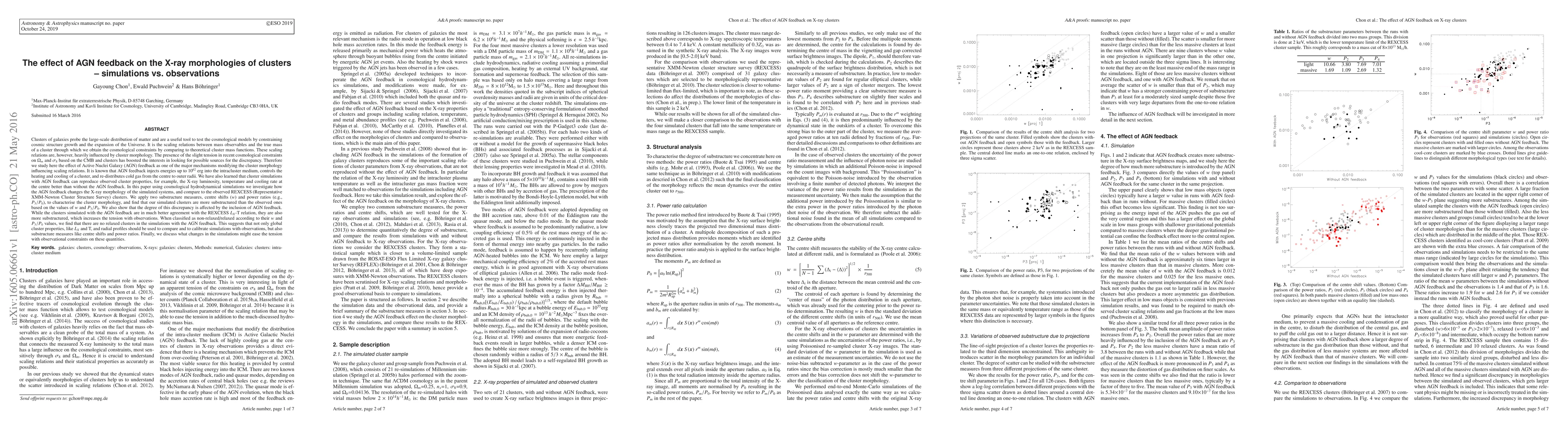 We study the effect of Active Nuclei Galaxy (AGN) feedback as one of the major mechanisms modifying the cluster morphology influencing scaling relations, which are the most uncertain factor in constraining cosmology with clusters of galaxies. Using cosmological hydrodynamical simulations we investigate how the AGN feedback changes the X-ray morphology of the simulated systems, and compare to the observed REXCESS (Representative XMM-Newton Cluster Structure Survey) clusters. We apply centre shifts and power ratios to characterise the cluster morphology, and find that our simulated clusters are more substructured than the observed ones. We show that the degree of this discrepancy is affected by the inclusion of AGN feedback. While the clusters simulated with the AGN feedback are in much better agreement with the REXCESS L_X-T relation, they are also more substructured, which increases the tension with observations. This suggests that not only global cluster properties such as L_X and T and radial profiles should be used to compare and to calibrate simulations with observations, but also substructure measures such as centre shifts and power ratios. We discuss what changes in the simulations might ease the tension with observational constraints on these quantities.
