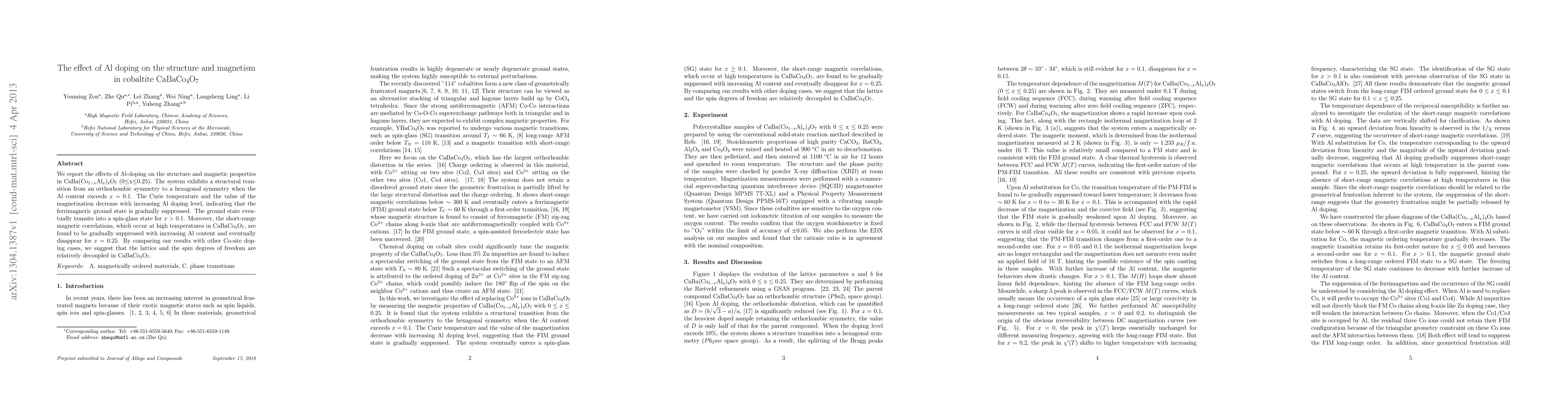 We report the effects of Al-doping on the structure and magnetic properties in CaBa(Co$_{1-x}$Al$_{x}$)$_4$O$_7$ (0$\leq$x$\leq$0.25). The system exhibits a structural transition from an orthorhombic symmetry to a hexagonal symmetry when the Al content exceeds $x =$ 0.1. The Curie temperature and the value of the magnetization decrease with increasing Al doping level, indicating that the ferrimagnetic ground state is gradually suppressed. The ground state eventually transits into a spin-glass state for $x >$ 0.1. Moreover, the short-range magnetic correlations, which occur at high temperatures in CaBaCo$_4$O$_7$, are found to be gradually suppressed with increasing Al content and eventually disappear for $x =$ 0.25. By comparing our results with other Co-site doping cases, we suggest that the lattice and the spin degrees of freedom are relatively decoupled in CaBaCo$_4$O$_7$.