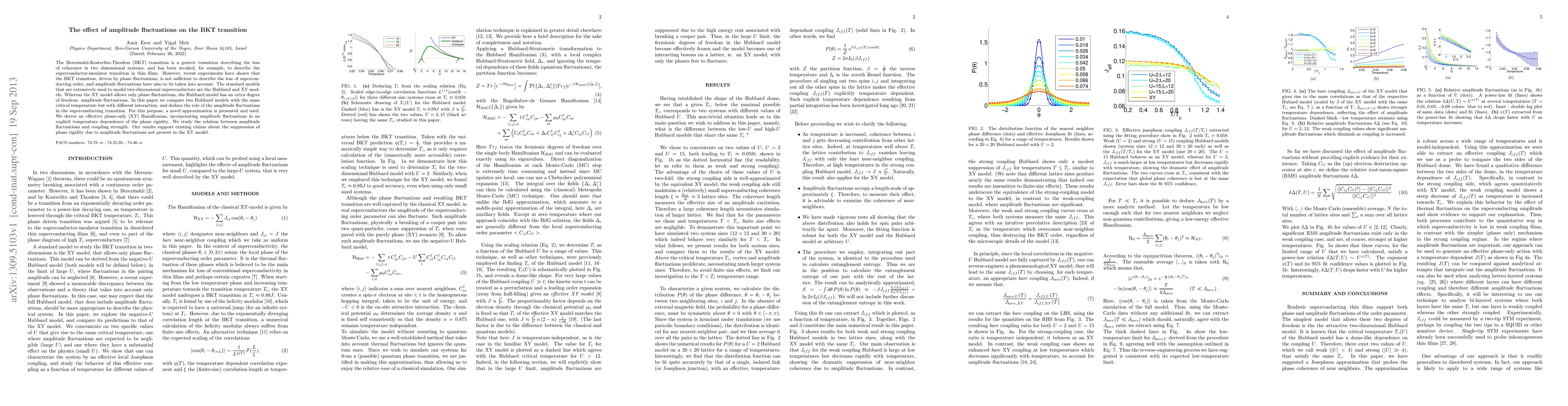 The Berezinskii-Kosterlitz-Thouless (BKT) transition is a generic transition describing the loss of coherence in two dimensional systems, and has been invoked, for example, to describe the superconductor-insulator transition in thin films. However, recent experiments have shown that the BKT transition, driven by phase fluctuations, is not sufficient to describe the loss of superconducting order, and amplitude fluctuations have also to be taken into account. The standard models that are extensively used to model two-dimensional superconductors are the Hubbard and XY models. Whereas the XY model allows only phase fluctuations, the Hubbard model has an extra degree of freedom: amplitude fluctuations. In this paper we compare two Hubbard models with the same critical temperature but with different interaction, and deduce the role of the amplitude fluctuations in the superconducting transition. For this purpose, a novel approximation is presented and used. We derive an effective phase-only (XY) Hamiltonian, incorporating amplitude fluctuations in an explicit temperature dependence of the phase rigidity. We study the relation between amplitude fluctuations and coupling strength. Our results support existing claims about the suppression of phase rigidity due to amplitude fluctuations not present in the XY model.