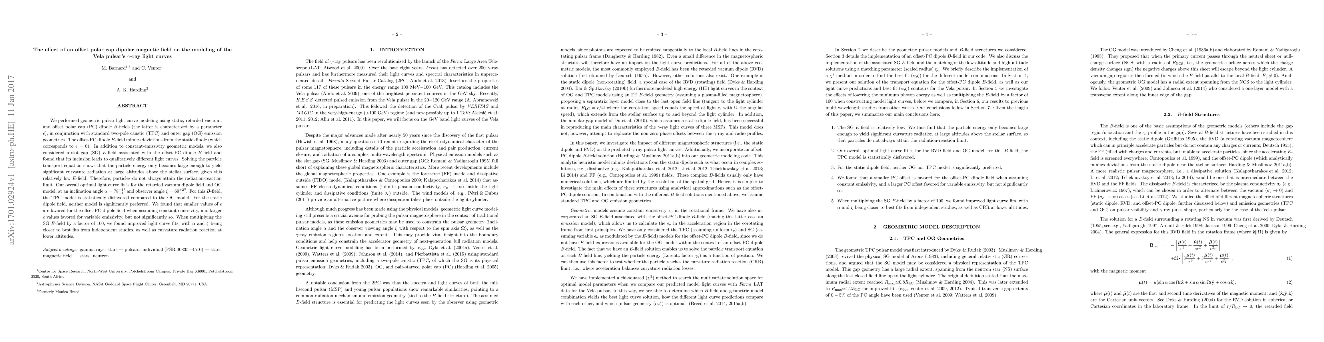 This study models the Vela pulsar's $\gamma$-ray light curves using offset polar cap dipole magnetic fields and various emission geometries, finding that the optimal fit is achieved with a retarded vacuum dipole field and outer gap model. Smaller offset parameters favor constant emissivity, while larger values are preferred for variable emissivity.