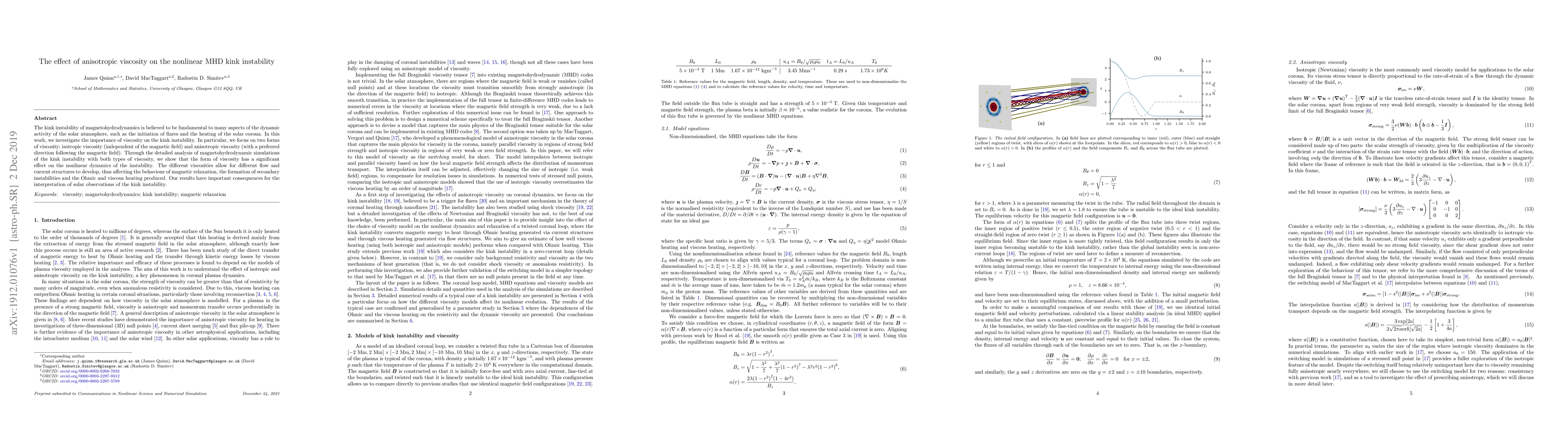 This paper explores how anisotropic viscosity influences the nonlinear kink instability in magnetohydrodynamics, demonstrating that it significantly alters the dynamics, flow structures, and heating processes compared to isotropic viscosity, which has implications for solar activity observations.