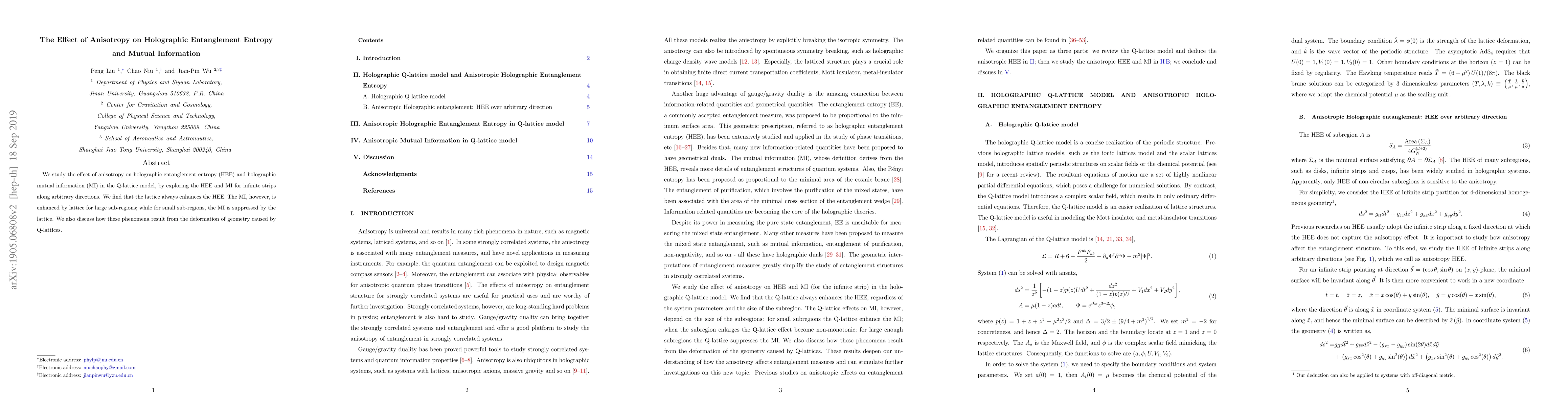 This paper investigates how anisotropy in the Q-lattice model affects holographic entanglement entropy and mutual information, revealing that lattices enhance entanglement entropy universally but either enhance or suppress mutual information depending on the size of the sub-region, due to geometric deformations caused by the lattice.