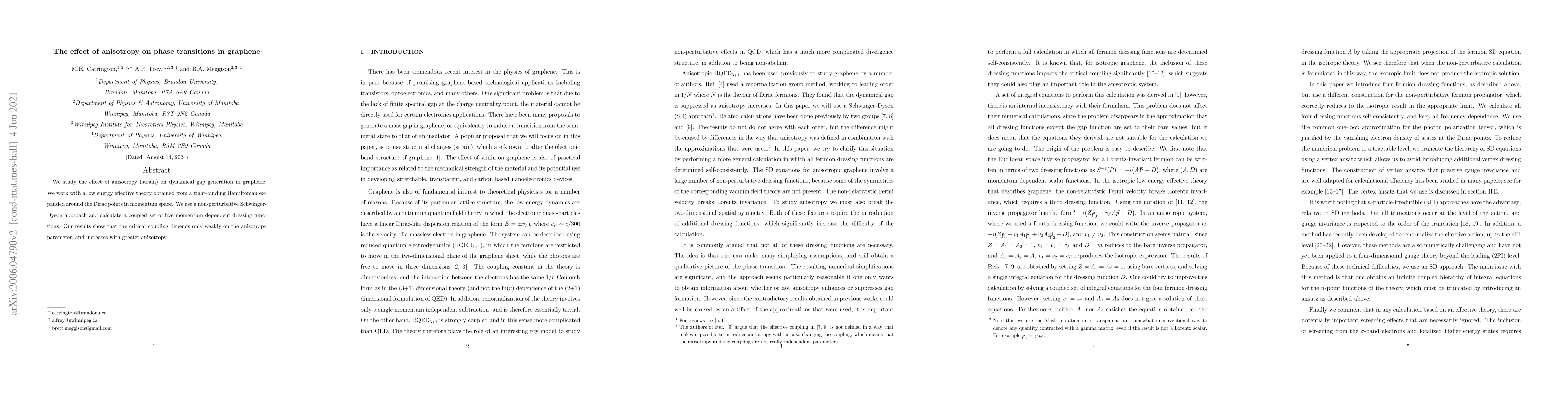 Summary: This study investigates how anisotropy (strain) influences phase transitions in graphene, revealing that while the critical coupling is only weakly dependent on the anisotropy parameter, it increases with greater anisotropy, using a non-perturbative Schwinger-Dyson approach.