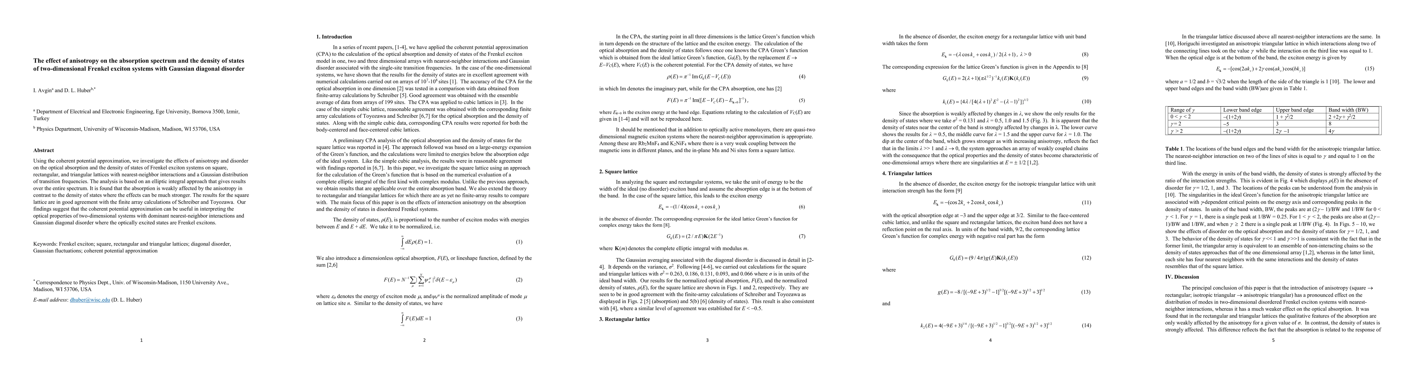 On the optical absorption and the density of states of Frenkel exciton systems on square, rectangular, and triangular lattices with nearest-neighbor interactions and a Gaussian distribution of transition frequencies. The analysis is based on an elliptic integral approach that gives results over the entire spectrum. It is found that the absorption is weakly affected by the anisotropy in contrast to the density of states where the effects can be much stronger. The results for the square lattice are in good agreement with the finite array calculations of Schreiber and Toyozawa. Our findings suggest that the coherent potential approximation can be useful in interpreting the optical properties of two-dimensional systems with dominant nearest-neighbor interactions and Gaussian diagonal disorder where the optically excited states are Frenkel excitons.