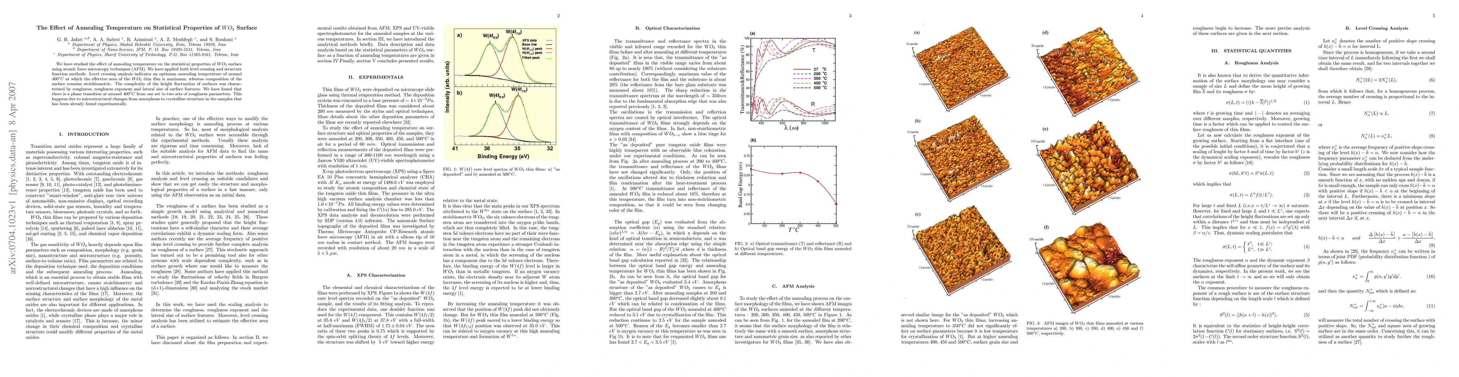 The study investigates how annealing temperature affects the surface properties of WO3 using atomic force microscopy. It finds an optimal temperature of around 400°C that maximizes the effective area of the thin film while maintaining a stoichiometric composition.