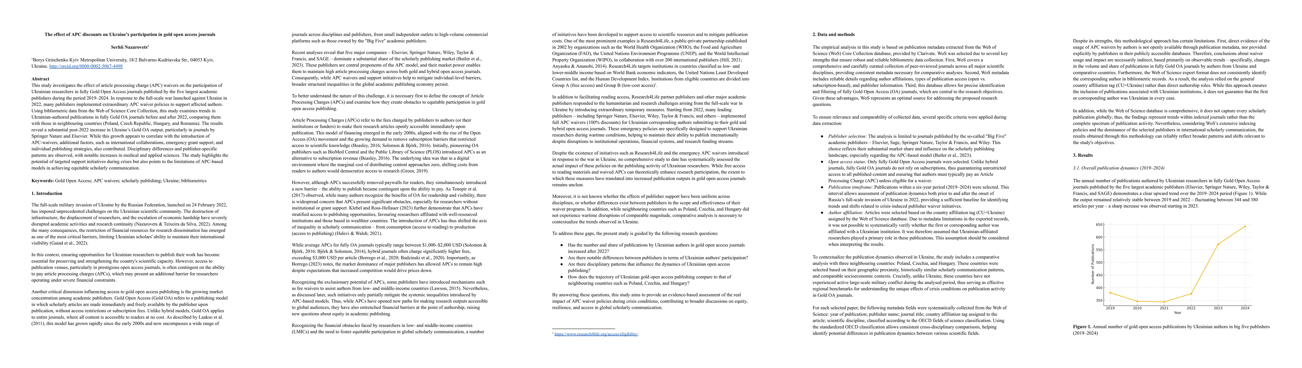 The study provides a detailed analysis of bibliometric data to assess the effect of APC discounts on Ukrainian researchers' participation in Gold Open Access journals.