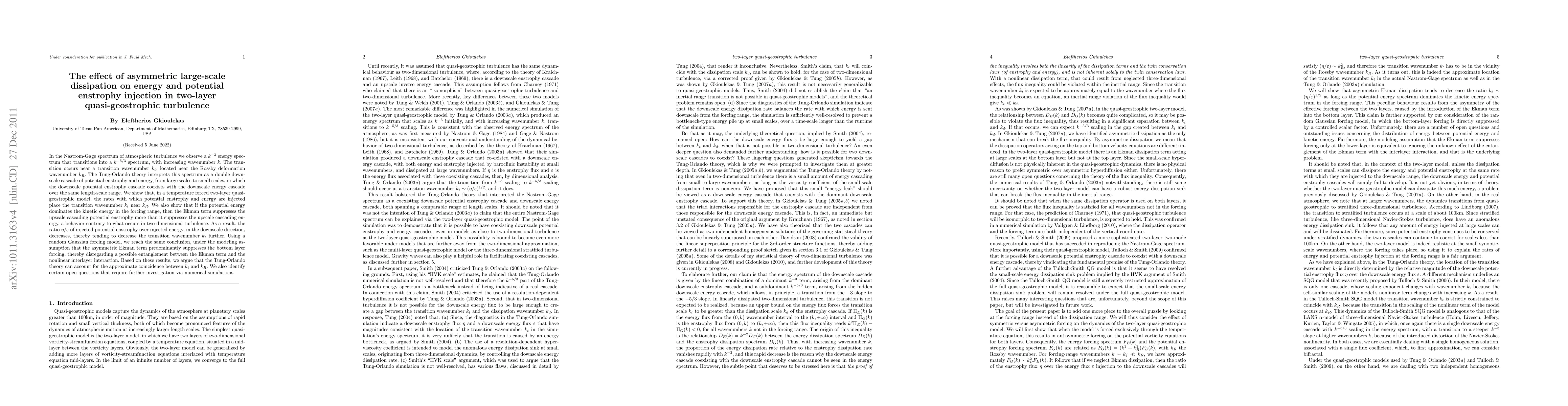 This paper investigates the effect of asymmetric large-scale dissipation on energy and potential enstrophy injection in two-layer quasi-geostrophic turbulence, showing that the transition wavenumber aligns with the Rossby deformation wavenumber due to the suppression of upscale cascading potential enstrophy by the Ekman term. It concludes that the Tung-Orlando theory can explain the observed coincidence between these wavenumbers.