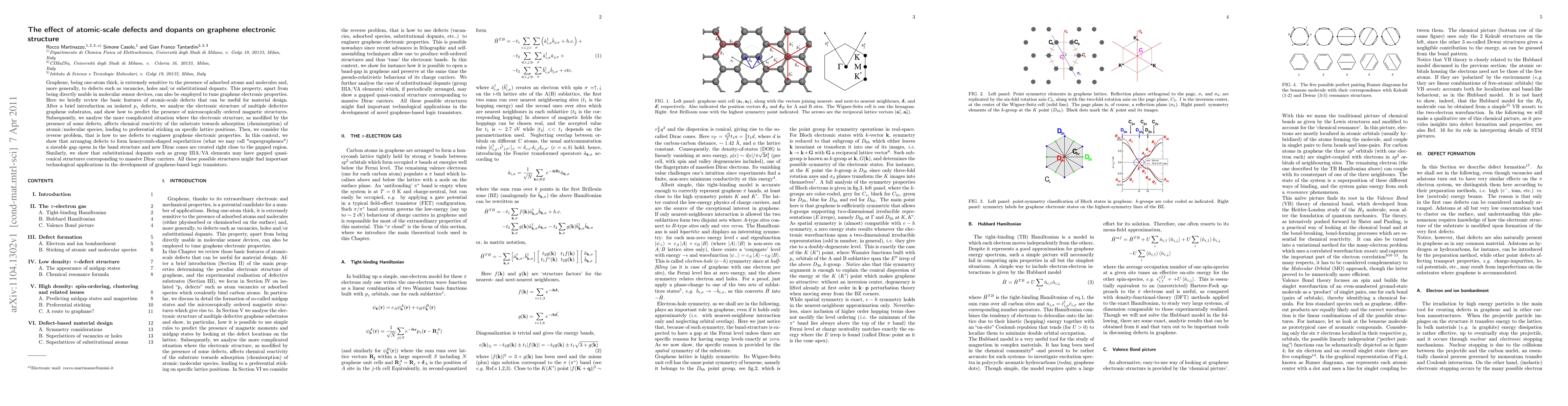 Graphene, being one-atom thick, is extremely sensitive to the presence of adsorbed atoms and molecules and, more generally, to defects such as vacancies, holes and/or substitutional dopants. This property, apart from being directly usable in molecular sensor devices, can also be employed to tune graphene electronic properties. Here we briefly review the basic features of atomic-scale defects that can be useful for material design. After a brief introduction on isolated $p_z$ defects, we analyse the electronic structure of multiple defective graphene substrates, and show how to predict the presence of microscopically ordered magnetic structures. Subsequently, we analyse the more complicated situation where the electronic structure, as modified by the presence of some defects, affects chemical reactivity of the substrate towards adsorption (chemisorption) of atomic/molecular species, leading to preferential sticking on specific lattice positions. Then, we consider the reverse problem, that is how to use defects to engineer graphene electronic properties. In this context, we show that arranging defects to form honeycomb-shaped superlattices (what we may call "supergraphenes") a sizeable gap opens in the band structure and new Dirac cones are created right close to the gapped region. Similarly, we show that substitutional dopants such as group IIIA/VA elements may have gapped quasi-conical structures corresponding to massive Dirac carriers. All these possible structures might find important technological applications in the development of graphene-based logic transistors.