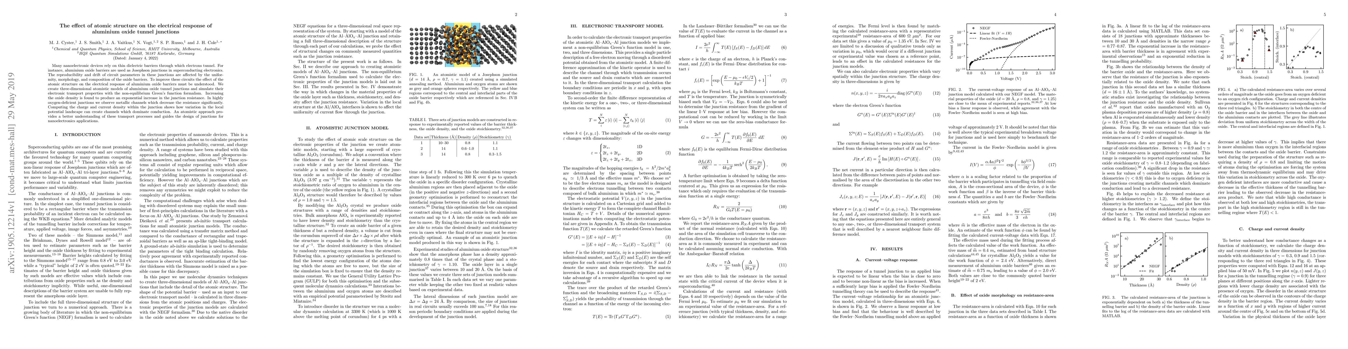 This study investigates how atomic structure influences the electrical response of aluminium oxide tunnel junctions, crucial for nanoelectronic devices. Simulations reveal that increased oxide density exponentially raises junction resistance, while oxygen deficiencies create metallic channels that significantly reduce it, highlighting the importance of atomic structure for optimizing circuit performance.