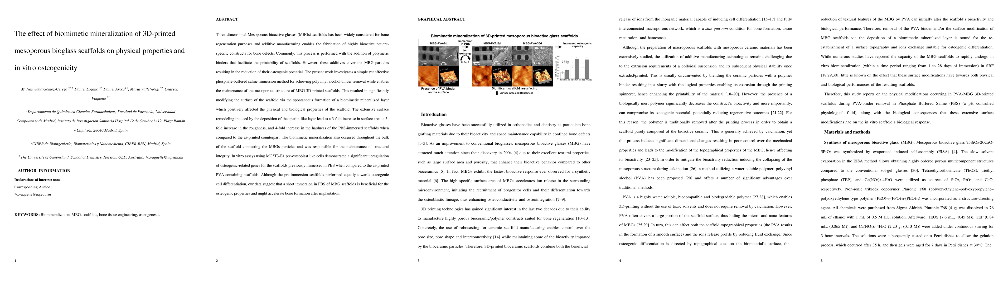 This study explores the biomimetic mineralization of 3D-printed mesoporous bioglass scaffolds via phosphate-buffered saline immersion, enhancing their physical properties and osteogenicity. The process increased surface area, roughness, and hardness while maintaining structural integrity, and significantly upregulated osteogenic-related genes in vitro.