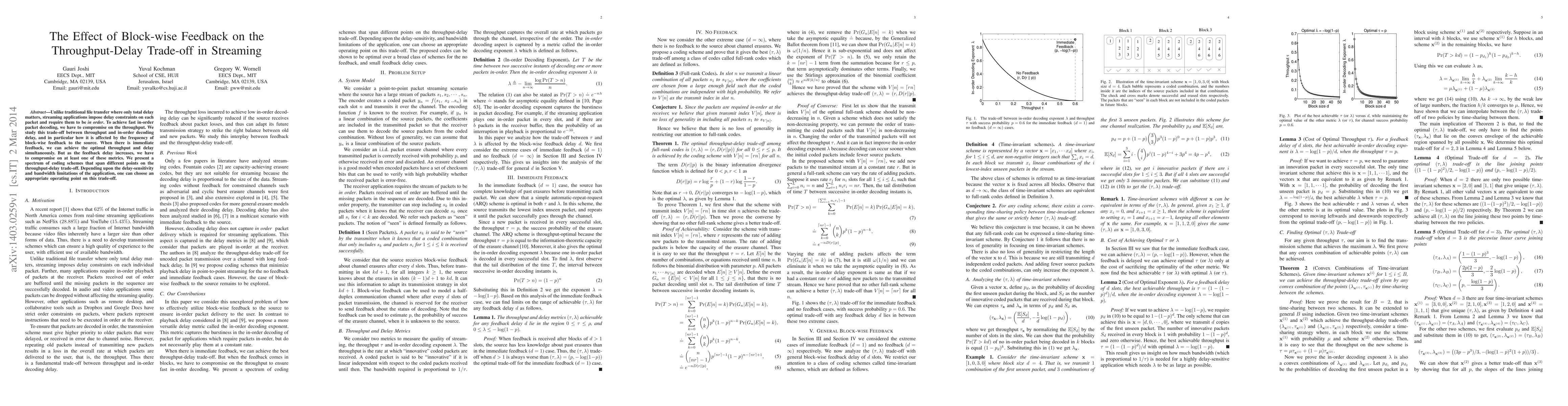 Unlike traditional file transfer where only total delay matters, streaming applications impose delay constraints on each packet and require them to be in order. To achieve fast in-order packet decoding, we have to compromise on the throughput. We study this trade-off between throughput and in-order decoding delay, and in particular how it is affected by the frequency of block-wise feedback to the source. When there is immediate feedback, we can achieve the optimal throughput and delay simultaneously. But as the feedback delay increases, we have to compromise on at least one of these metrics. We present a spectrum of coding schemes that span different points on the throughput-delay trade-off. Depending upon the delay-sensitivity and bandwidth limitations of the application, one can choose an appropriate operating point on this trade-off.
