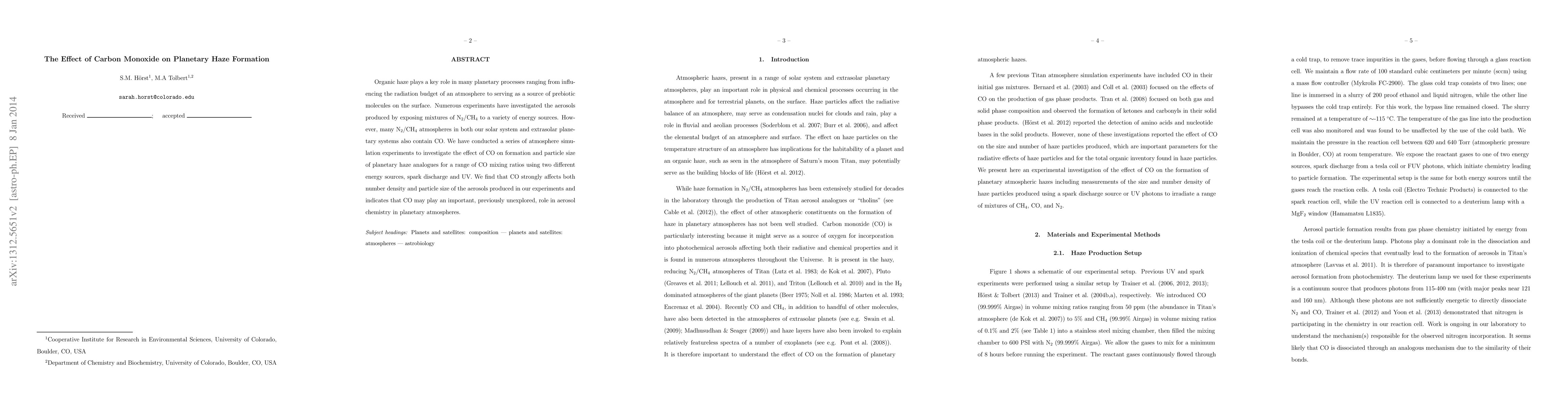 Understanding the effect of CO on haze formation is crucial for interpreting observations of planetary atmospheres in our solar system and extrasolar planetary systems, as well as for assessing the potential for prebiotic chemistry.