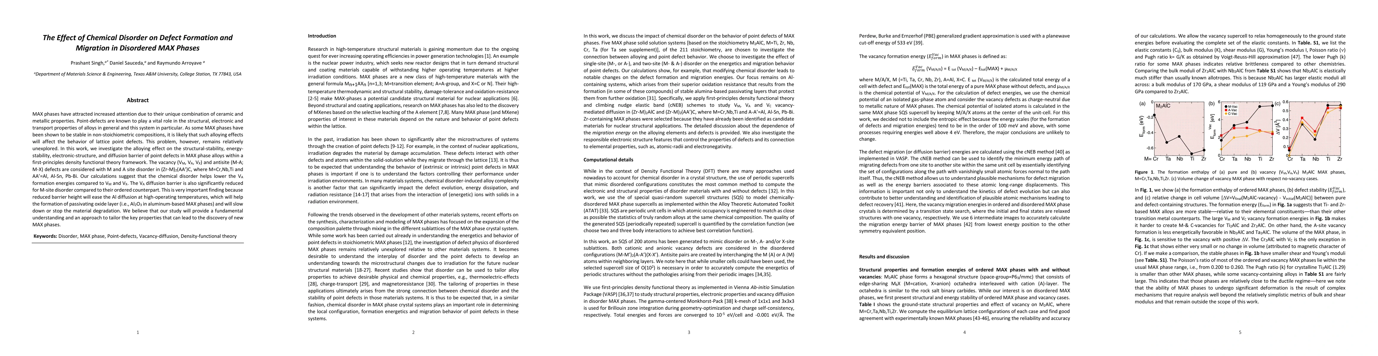 MAX phases have attracted increased attention due to their unique combination of ceramic and metallic properties. Point-defects are known to play a vital role in the structural, electronic and transport properties of alloys in general and this system in particular. As some MAX phases have been shown to be stable in non-stoichiometric compositions, it is likely that such alloying effects will affect the behavior of lattice point defects. This problem, however, remains relatively unexplored. In this work, we investigate the alloying effect on the structural-stability, energy-stability, electronic-structure, and diffusion barrier of point defects in MAX phase alloys within a first-principles density functional theory framework. The vacancy (V$_{M}$, V$_{A}$, V$_{X}$) and antisite (M-A; M-X) defects are considered with M and A site disorder in (Zr-M)$_{2}$(AA${'}$)C, where M=Cr,Nb,Ti and AA${'}$=Al, Al-Sn, Pb-Bi. Our calculations suggest that the chemical disorder helps lower the V$_{A}$ formation energies compared to V$_{M}$ and V$_{X}$. The V$_{A}$ diffusion barrier is also significantly reduced for M-site disorder compared to their ordered counterpart. This is very important finding because reduced barrier height will ease the Al diffusion at high-operating temperatures, which will help the formation of passivating oxide layer (i.e., Al$_{2}$O$_{3}$ in aluminum-based MAX phases) and will slow down or stop the material degradation. We believe that our study will provide a fundamental understanding and an approach to tailor the key properties that can lead to the discovery of new MAX phases.