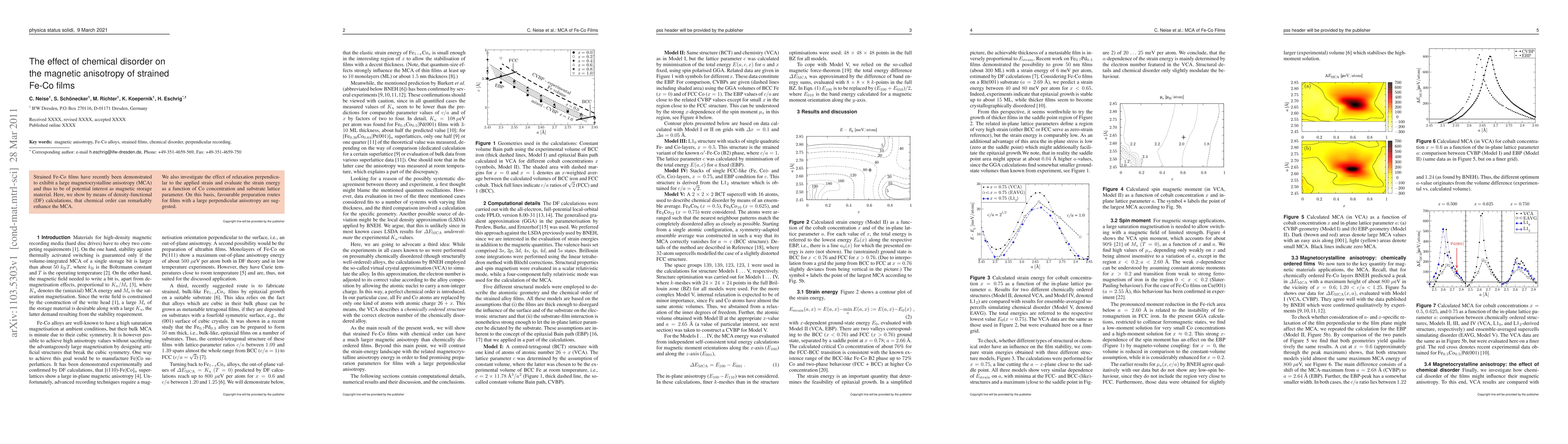 This study uses density-functional calculations to demonstrate that chemical order significantly enhances the magnetocrystalline anisotropy (MCA) in strained Fe-Co films, which are promising candidates for magnetic storage. The research also evaluates the strain energy and suggests optimal preparation methods for achieving large perpendicular anisotropy.