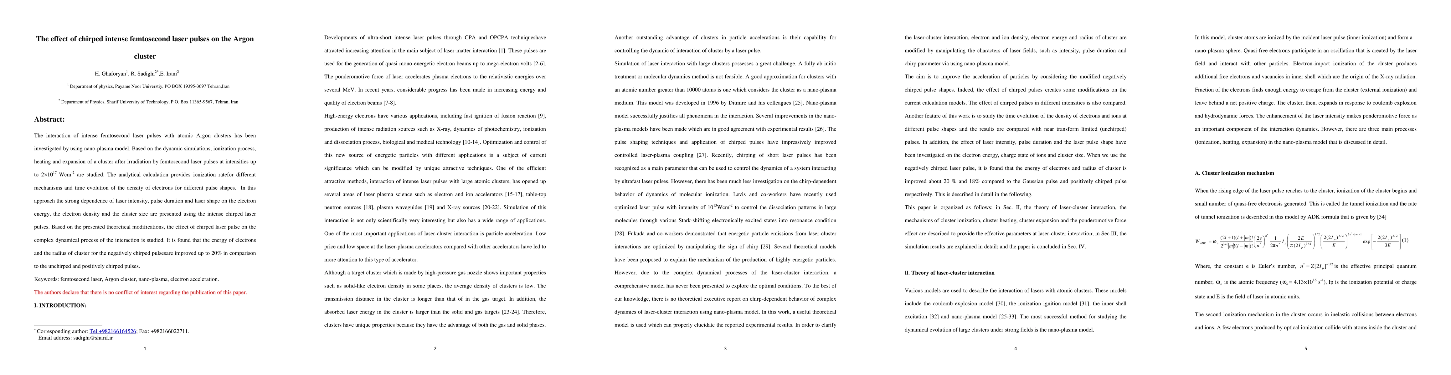 This study investigates the interaction of intense femtosecond laser pulses with Argon clusters, revealing that chirped pulses enhance electron energy and cluster radius by up to 20% compared to unchirped and positively chirped pulses. The research uses a nano-plasma model to simulate ionization, heating, and expansion processes.