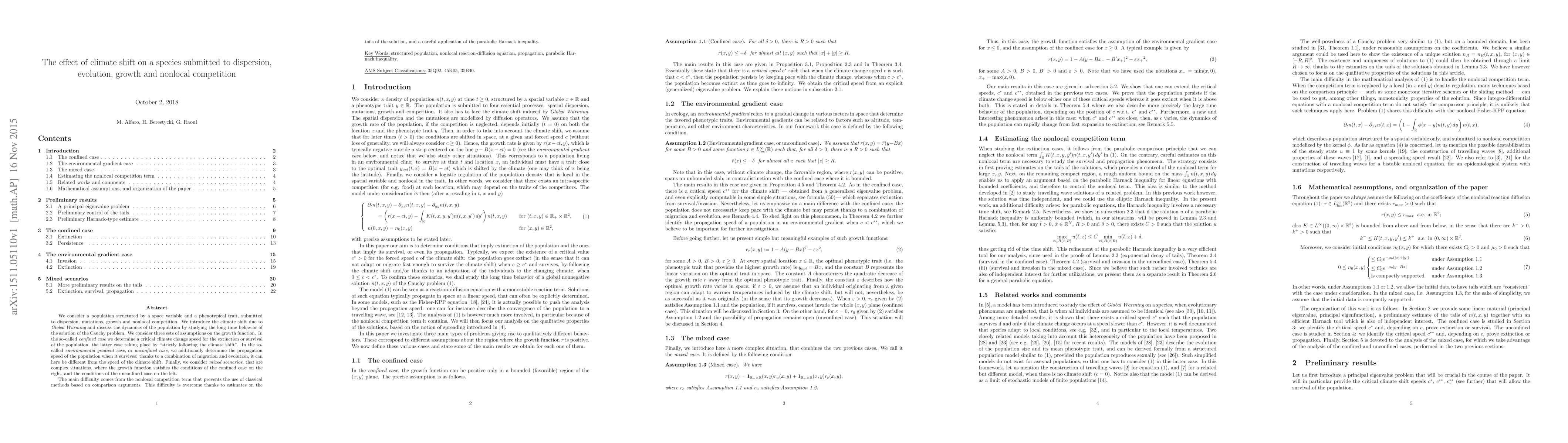 We consider a population structured by a spacevariable and a phenotypical trait, submitted to dispersion,mutations, growth and nonlocal competition. We introduce theclimate shift due to {\it Global Warming} and discuss the dynamicsof the population by studying the long time behavior of thesolution of the Cauchy problem. We consider three sets ofassumptions on the growth function. In the so-called {\it confinedcase} we determine a critical climate change speed for theextinction or survival of the population, the latter case taking place by "strictly following the climate shift". In the so-called {\itenvironmental gradient case}, or {\it unconfined case}, we additionally determine the propagation speedof the population when it survives: thanks to a combination of migration and evolution, it can here be different from the speed of the climate shift. Finally, we consider {\it mixed scenarios}, that are complex situations, where thegrowth function satisfies the conditions of the confined case on the right, and the conditions of the unconfined case on the left.The main difficulty comes from the nonlocal competition term that prevents the use of classical methods based on comparison arguments. This difficulty is overcome thanks to estimates on the tails of the solution, and a careful application of the parabolic Harnack inequality.