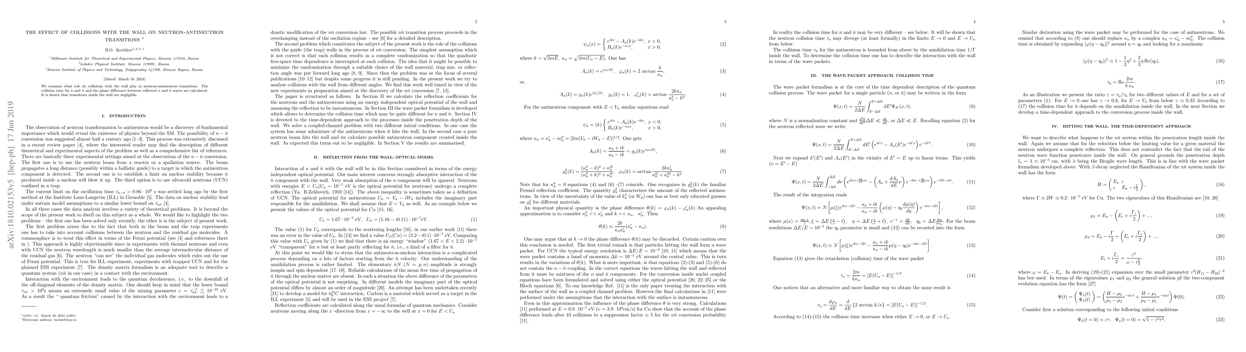 Summary: This study investigates the impact of wall collisions on neutron-antineutron transitions, finding that such collisions are insignificant due to negligible transitions within the wall and the phase difference between reflected neutron and antineutron waves.