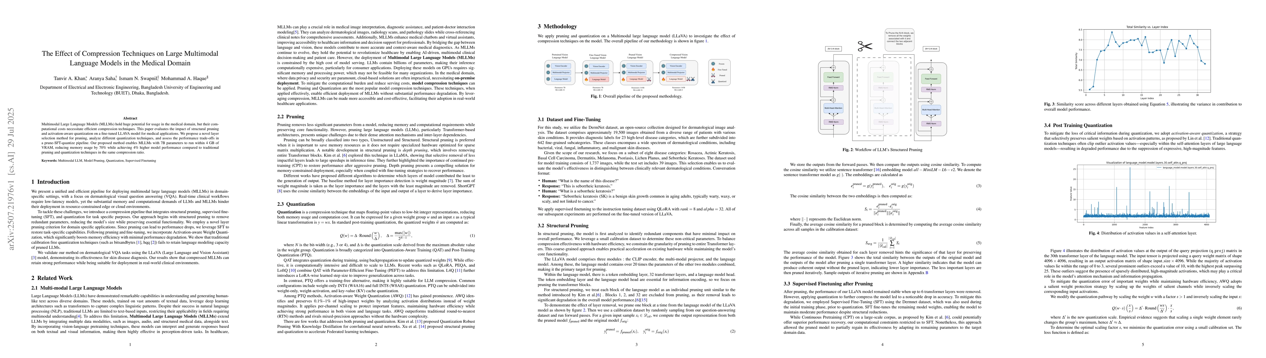 Multimodal Large Language Models (MLLMs) hold huge potential for usage in the medical domain, but their computational costs necessitate efficient compression techniques. This paper evaluates the impact of structural pruning and activation-aware quantization on a fine-tuned LLAVA model for medical applications. We propose a novel layer selection method for pruning, analyze different quantization techniques, and assess the performance trade-offs in a prune-SFT-quantize pipeline. Our proposed method enables MLLMs with 7B parameters to run within 4 GB of VRAM, reducing memory usage by 70% while achieving 4% higher model performance compared to traditional pruning and quantization techniques in the same compression ratio.