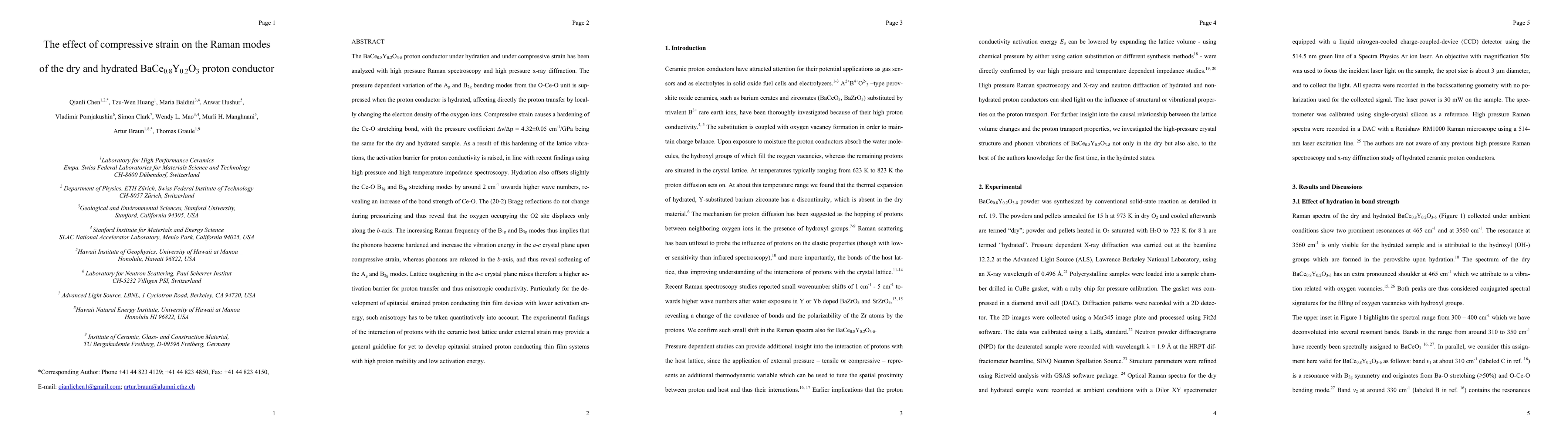 The BaCe0.8Y0.2O3 proton conductor's conductivity is affected by compressive strain, with hydrated samples showing suppressed bending modes and increased activation energy. Strain causes anisotropic conductivity by hardening phonons in the a-c crystal plane.