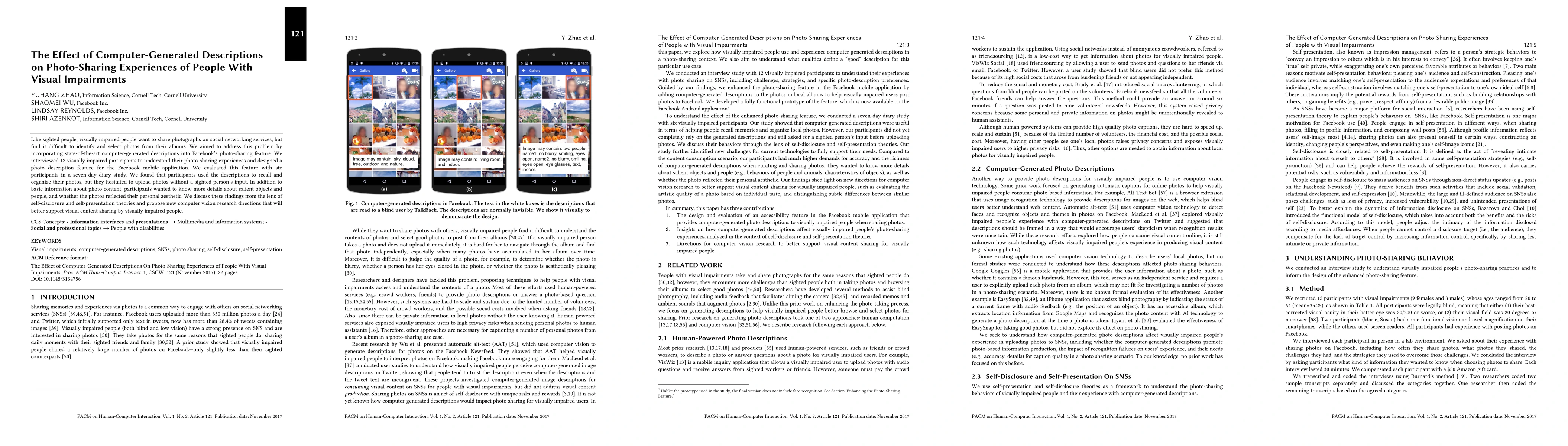 Like sighted people, visually impaired people want to share photographs on social networking services, but find it difficult to identify and select photos from their albums. We aimed to address this problem by incorporating state-of-the-art computer-generated descriptions into Facebook's photo-sharing feature. We interviewed 12 visually impaired participants to understand their photo-sharing experiences and designed a photo description feature for the Facebook mobile application. We evaluated this feature with six participants in a seven-day diary study. We found that participants used the descriptions to recall and organize their photos, but they hesitated to upload photos without a sighted person's input. In addition to basic information about photo content, participants wanted to know more details about salient objects and people, and whether the photos reflected their personal aesthetics. We discuss these findings from the lens of self-disclosure and self-presentation theories and propose new computer vision research directions that will better support visual content sharing by visually impaired people.