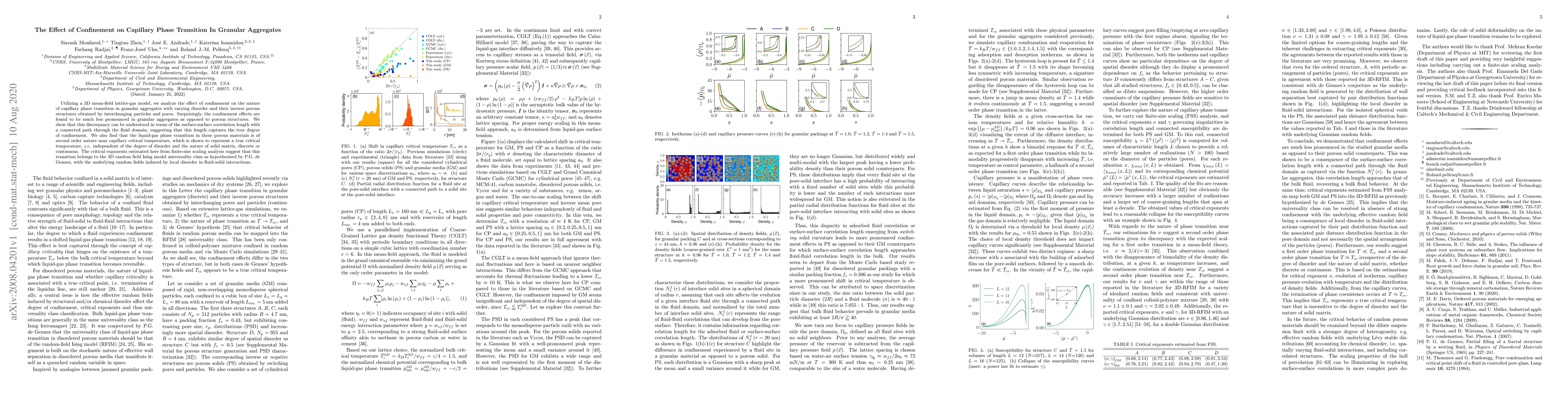 This study uses a 3D mean-field lattice-gas model to investigate how confinement influences capillary phase transitions in granular aggregates and their inverse porous structures. The research reveals that confinement effects are less significant in granular aggregates compared to porous structures, attributed to the surface-surface correlation length. The liquid-gas phase transition in porous materials is identified as second-order near the capillary critical temperature, belonging to the 3D random field Ising model universality class.
