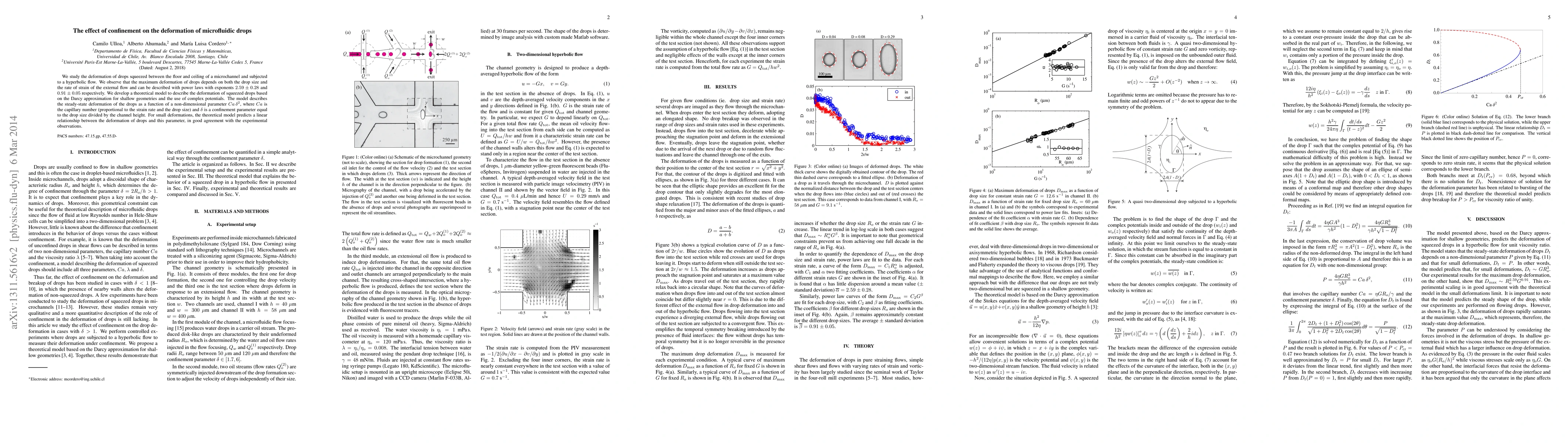 We study the deformation of drops squeezed between the floor and ceiling of a microchannel and subjected to a hyperbolic flow. We observe that the maximum deformation of drops depends on both the drop size and the rate of strain of the external flow and can be described with power laws with exponents 2.59 +/- 0.28 and 0.91 +/- 0.05 respectively. We develop a theoretical model to describe the deformation of squeezed drops based on the Darcy approximation for shallow geometries and the use of complex potentials. The model describes the steady-state deformation of the drops as a function of a non-dimensional parameter Ca d^2, where Ca is the capillary number (proportional to the strain rate and the drop size) and d is a confinement parameter equal to the drop size divided by the channel height. For small deformations, the theoretical model predicts a linear relationship between the deformation of drops and this parameter, in good agreement with the experimental observations.