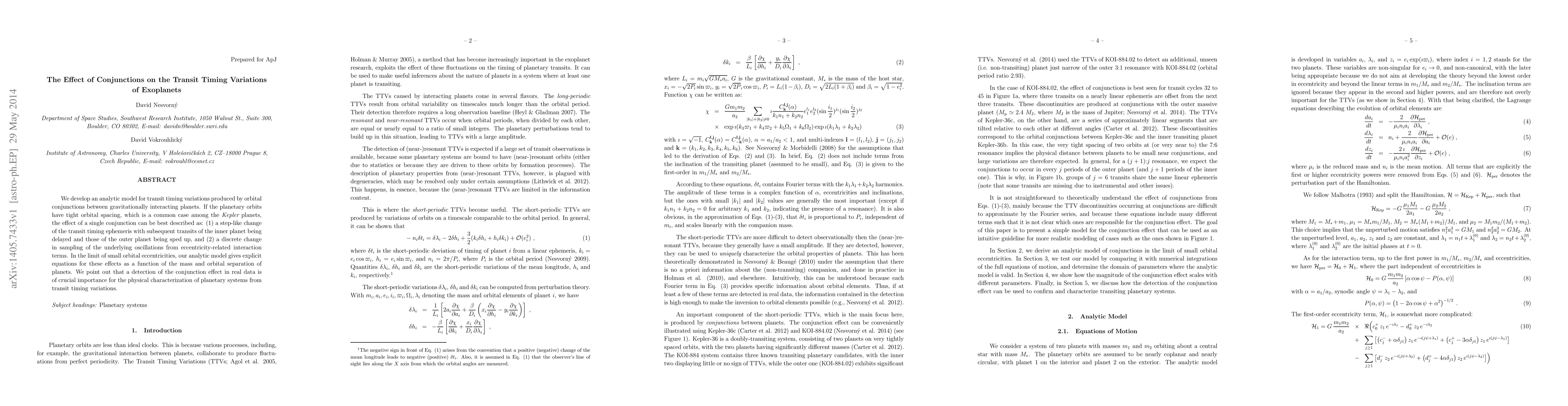 This paper develops an analytic model for transit timing variations caused by orbital conjunctions between gravitationally interacting planets, showing that such conjunctions lead to step-like changes in transit timing and affect the sampling of eccentricity-related oscillations. Detecting these effects is crucial for understanding planetary systems through transit timing variations.