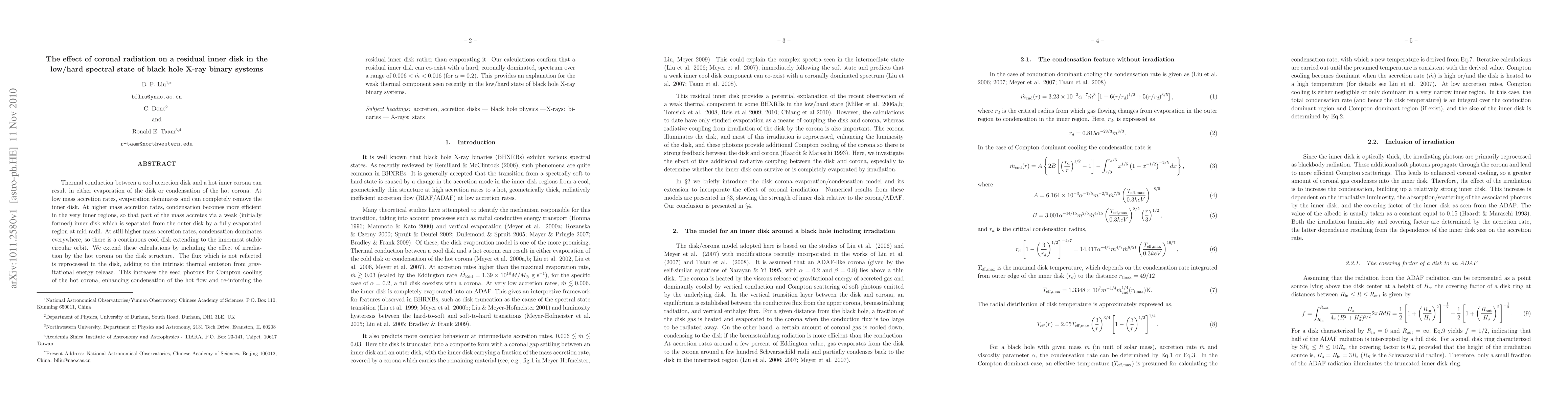 Thermal conduction between a cool accretion disk and a hot inner corona can result in either evaporation of the disk or condensation of the hot corona. At low mass accretion rates, evaporation dominates and can completely remove the inner disk. At higher mass accretion rates, condensation becomes more efficient in the very inner regions, so that part of the mass accretes via a weak (initially formed) inner disk which is separated from the outer disk by a fully evaporated region at mid radii. At still higher mass accretion rates, condensation dominates everywhere, so there is a continuous cool disk extending to the innermost stable circular orbit. We extend these calculations by including the effect of irradiation by the hot corona on the disk structure. The flux which is not reflected is reprocessed in the disk, adding to the intrinsic thermal emission from gravitational energy release. This increases the seed photons for Compton cooling of the hot corona, enhancing condensation of the hot flow and re-inforcing the residual inner disk rather than evaporating it. Our calculations confirm that a residual inner disk can co-exist with a hard, coronally dominated, spectrum over a range of $0.006<\dot m<0.016$ (for $\alpha=0.2$). This provides an explanation for the weak thermal component seen recently in the low/hard state of black hole X-ray binary systems.