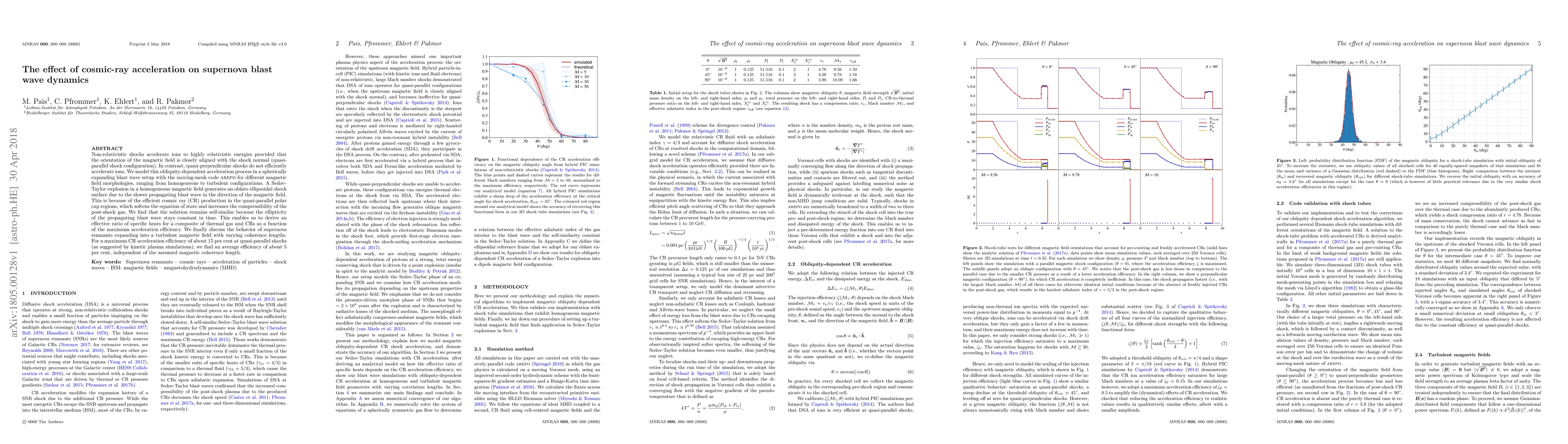This research models supernova blast wave dynamics under cosmic-ray acceleration, finding that quasi-parallel shocks efficiently accelerate ions while quasi-perpendicular shocks do not. Using the moving-mesh code AREPO, they simulate various magnetic field morphologies. The study reveals that a Sedov-Taylor explosion in a homogeneous magnetic field creates an oblate ellipsoidal shock due to CR production, softening the equation of state. The solution maintains self-similarity, enabling an effective ratio of specific heats for thermal gas and CRs. For turbulent magnetic fields, the average CR acceleration efficiency is around 5%, regardless of coherence length.