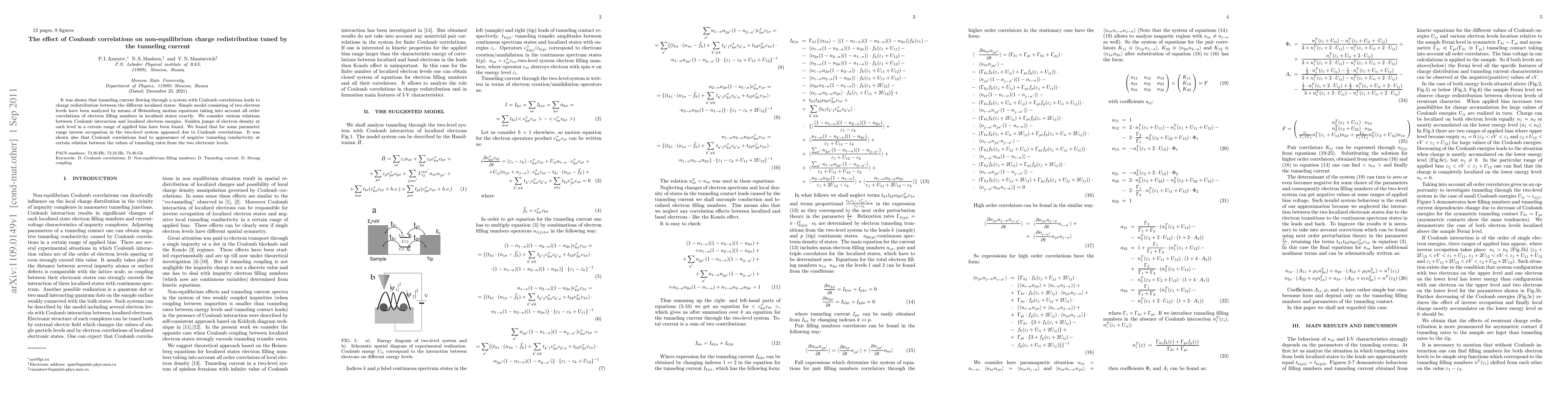 It was shown that tunneling current flowing through a system with Coulomb correlations leads to charge redistribution between the different localized states. Simple model consisting of two electron levels have been analyzed by means of Heisenberg motion equations taking into account all order correlations of electron filling numbers in localized states exactly. We consider various relations between Coulomb interaction and localized electron energies. Sudden jumps of electron density at each level in a certain range of applied bias have been found. We found that for some parameter range inverse occupation in the two-level system appeared due to Coulomb correlations. It was shown also that Coulomb correlations lead to appearance of negative tunneling conductivity at certain relation between the values of tunneling rates from the two electronic levels.