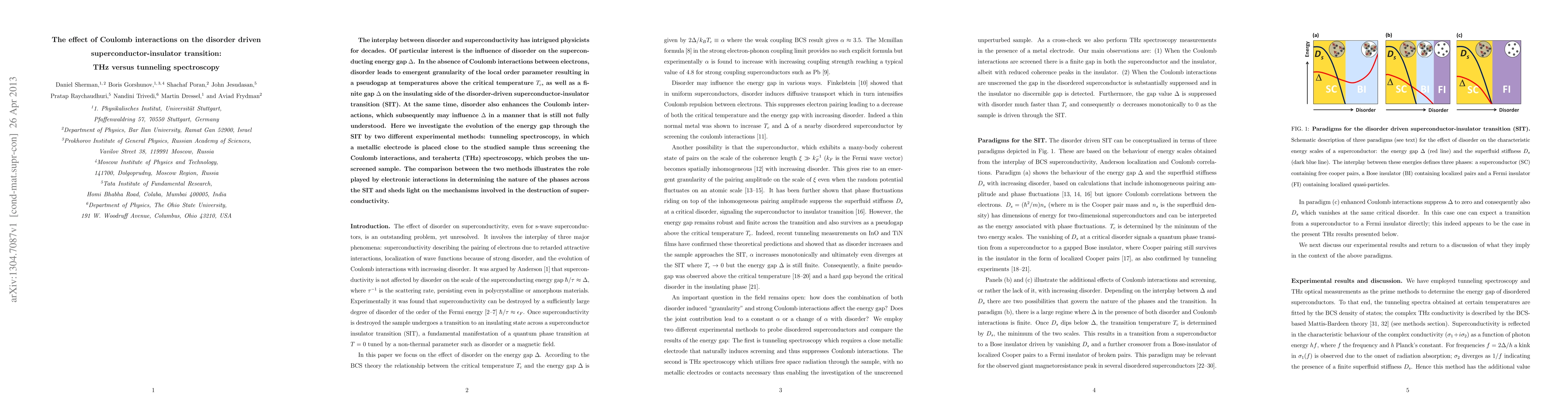 This paper investigates the impact of Coulomb interactions on the disorder-driven superconductor-insulator transition using tunneling and THz spectroscopy. The study reveals how electronic interactions influence the superconducting energy gap and the nature of phases across the transition.