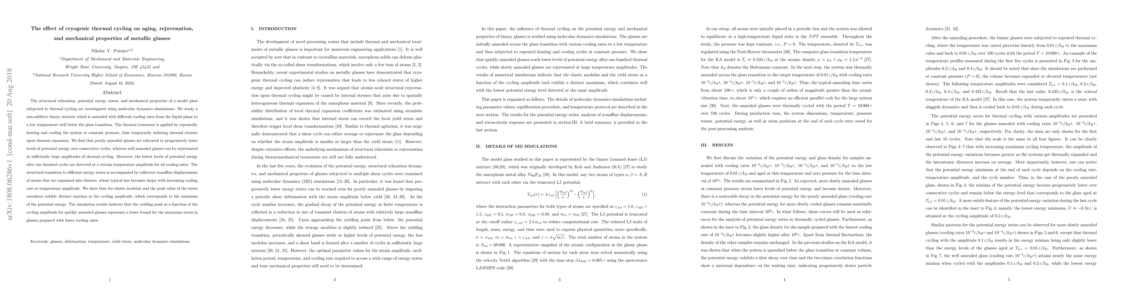 This study investigates the impact of cryogenic thermal cycling on metallic glasses using molecular dynamics simulations. Results show that poorly annealed glasses progressively lower their potential energy, while well-annealed glasses can rejuvenate with sufficient cycling, indicating a relationship between thermal cycling amplitude and mechanical properties.