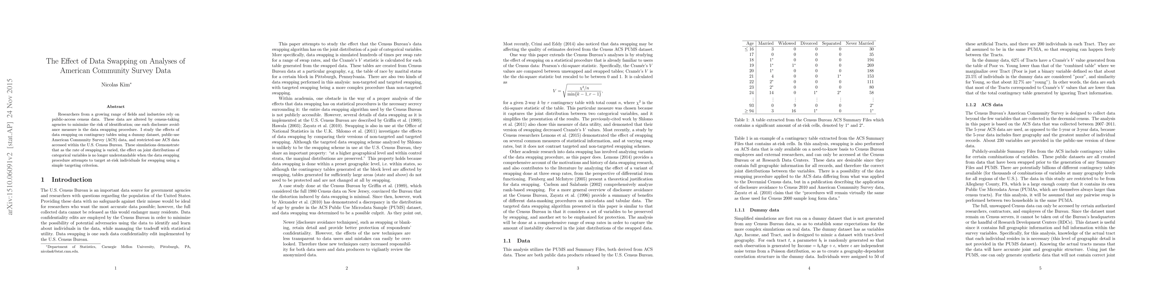 Summary: This study examines how data swapping, a method used to protect individual privacy in public-access census data, affects contingency table analyses using American Community Survey (ACS) data. The results show that when data swapping targets at-risk individuals based on a simple criterion, it complicates the interpretation of joint distributions of categorical variables.