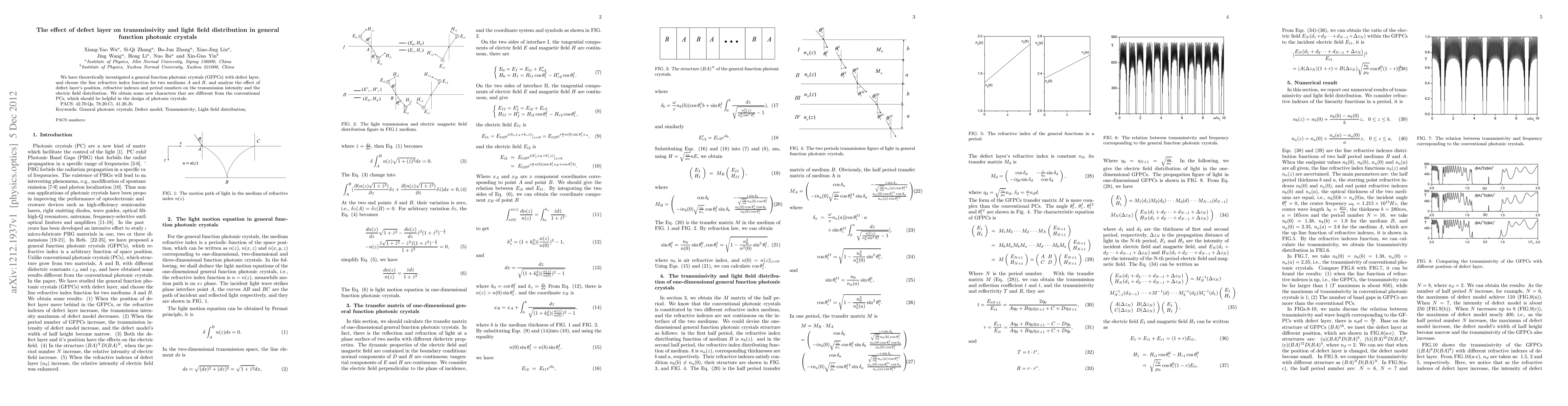 This paper theoretically investigates the impact of defect layers on the transmissivity and light field distribution in general function photonic crystals (GFPCs), analyzing how factors like defect layer position, refractive indexes, and period numbers influence transmission intensity and electric field distribution, revealing unique characteristics useful for photonic crystal design.