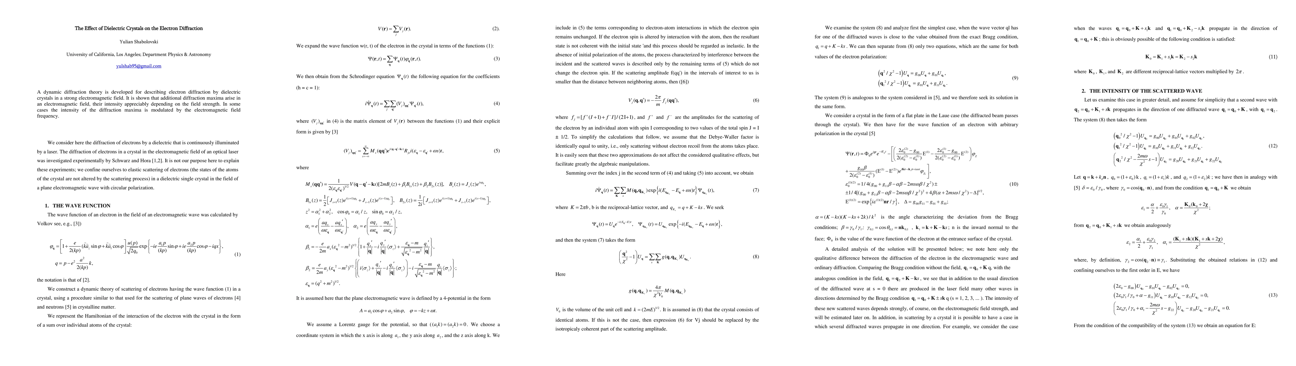 This paper develops a dynamic diffraction theory for electron diffraction by dielectric crystals under strong electromagnetic fields, revealing additional diffraction maxima whose intensity is significantly influenced by both field strength and frequency.