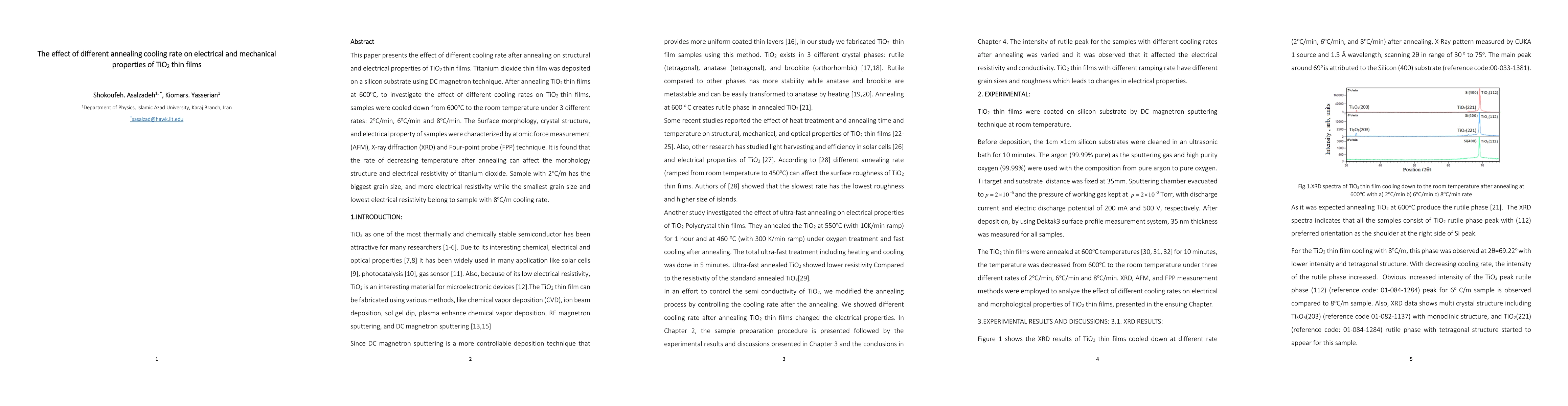 This paper presents the effect of different cooling rate after annealing on structural and electrical properties of TiO2 thin films. Titanium dioxide thin film was deposited on a silicon substrate using DC magnetron technique. After annealing TiO2 thin films at 600oC, to investigate the effect of different cooling rates on TiO2 thin films, samples were cooled down from 600oC to the room temperature under 3 different rates: 2oC/min, 6oC/min and 8oC/min. The Surface morphology, crystal structure, and electrical property of samples were characterized by atomic force measurement (AFM), X-ray diffraction (XRD) and Four-point probe (FPP) technique. It is found that the rate of decreasing temperature after annealing can affect the morphology structure and electrical resistivity of titanium dioxide. Sample with 2oC/m has the biggest grain size, and more electrical resistivity while the smallest grain size and lowest electrical resistivity belong to sample with 8oC/m cooling rate.