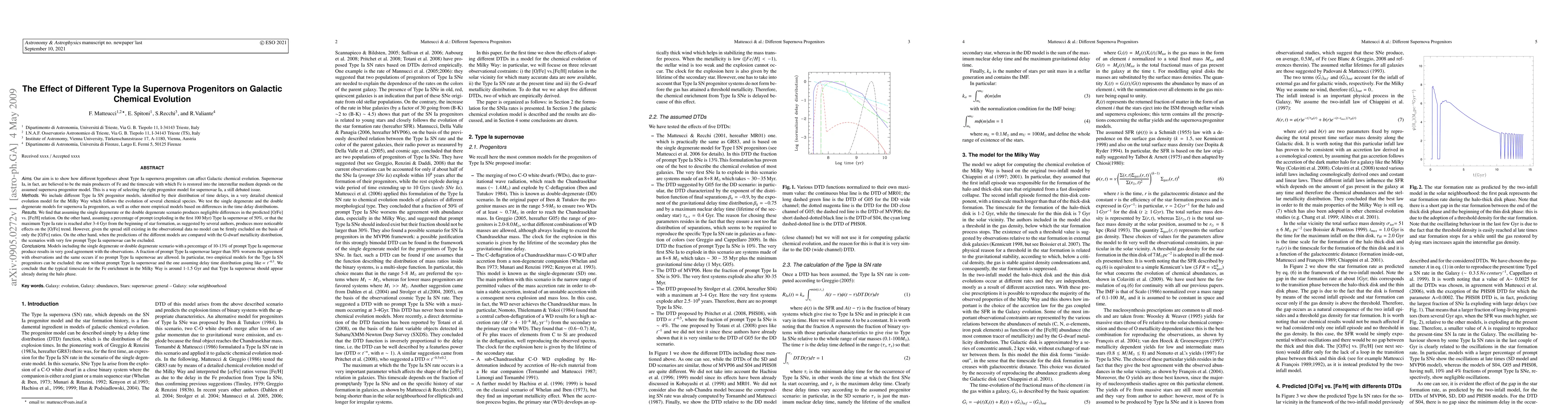 This paper investigates how different Type Ia supernova progenitor models impact Galactic chemical evolution, finding negligible differences between single and double degenerate models but significant effects from prompt Type Ia supernovae. Models with 10-13% prompt Type Ia supernovae best match observations, while those without prompt or following a t^{-0.5} distribution are excluded.
