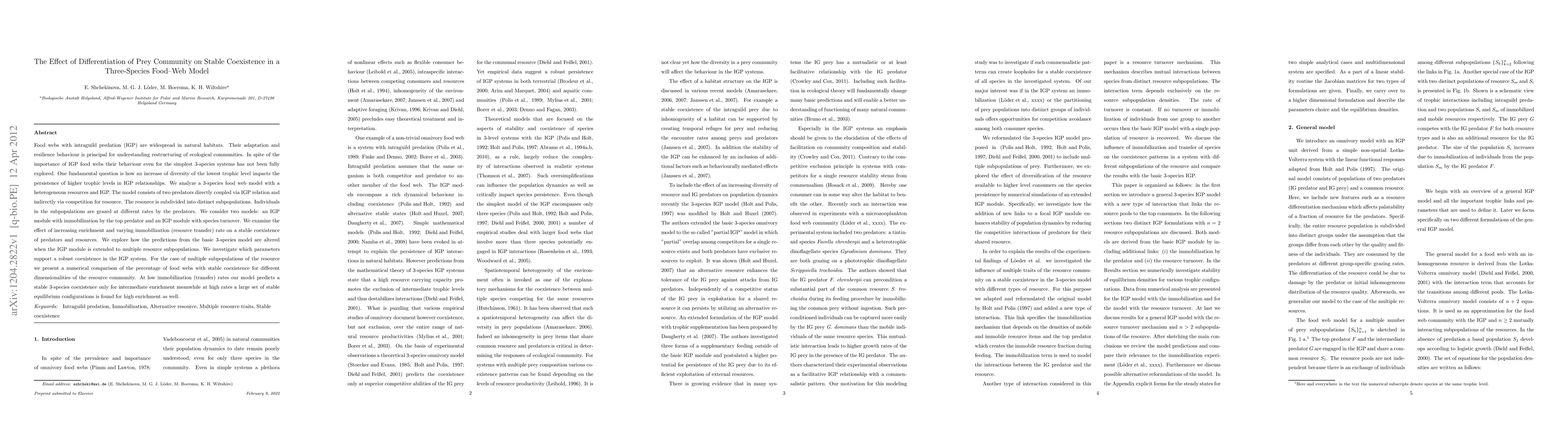 This paper investigates a three-species food web model with intraguild predation, examining how differentiation of the prey community affects stable coexistence. The model reveals that stable coexistence is possible at intermediate enrichment levels with low immobilization rates, while high enrichment levels support a wide range of stable equilibria at high immobilization rates.