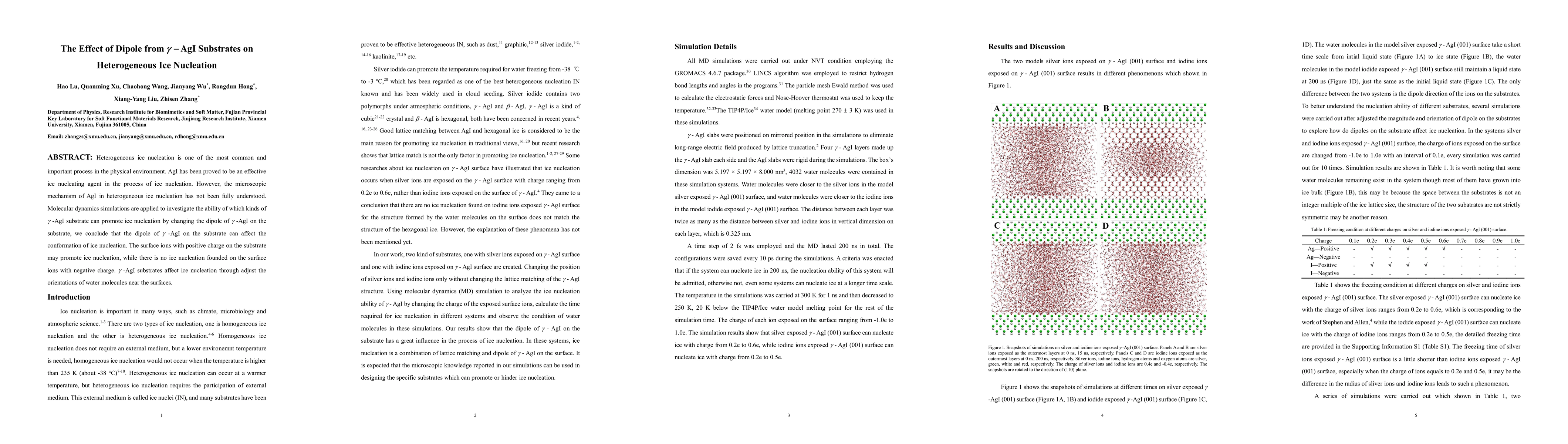 Molecular dynamics simulations were applied to investigate the effect of different dipoles on γ-AgI substrates on heterogeneous ice nucleation, focusing on the role of surface ions with positive and negative charges.