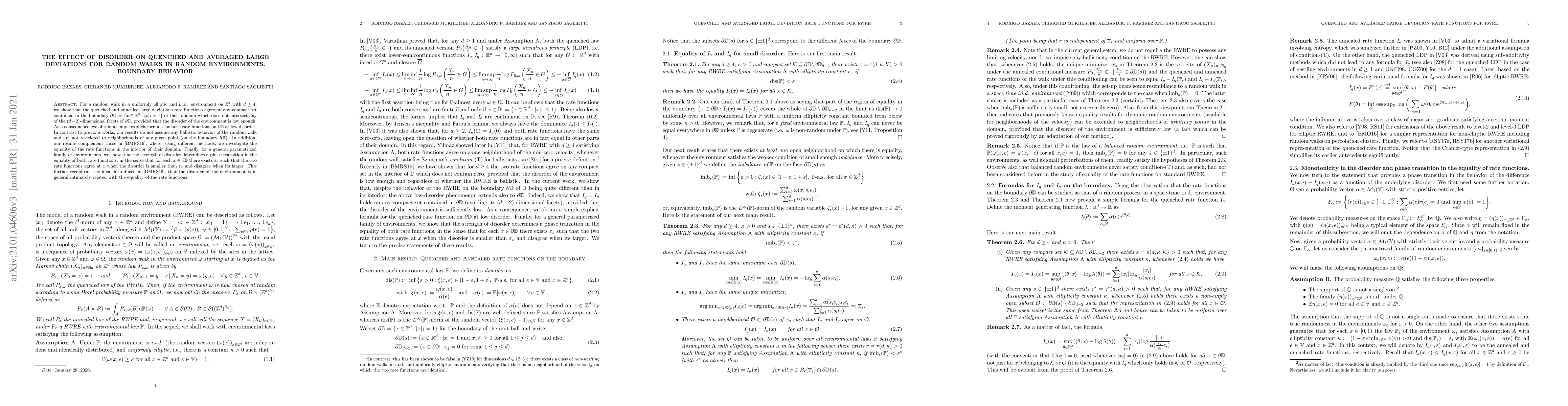 For a random walk in a uniformly elliptic and i.i.d. environment on $\mathbb Z^d$ with $d \geq 4$, we show that the quenched and annealed large deviations rate functions agree on any compact set contained in the boundary $\partial \mathbb{D}:=\{ x \in \mathbb R^d : |x|_1 =1\}$ of their domain which does not intersect any of the $(d-2)$-dimensional facets of $\partial \mathbb{D}$, provided that the disorder of the environment is~low~enough. As a consequence, we obtain a simple explicit formula for both rate functions on $\partial \mathbb{D}$ at low disorder. In contrast to previous works, our results do not assume any ballistic behavior of the random walk and are not restricted to neighborhoods of any given point (on the boundary $\partial \mathbb{D}$). In addition, our~results complement those in [BMRS19], where, using different methods, we investigate the equality of the rate functions in the interior of their domain. Finally, for a general parametrized family of environments, we~show that the strength of disorder determines a phase transition in the equality of both rate functions, in the sense that for each $x \in \partial \mathbb{D}$ there exists $\varepsilon_x$ such that the two rate functions agree at $x$ when the disorder is smaller than $\varepsilon_x$ and disagree when its larger. This further reconfirms the idea, introduced in [BMRS19], that the disorder of the environment is in general intimately related with the equality of the rate functions.