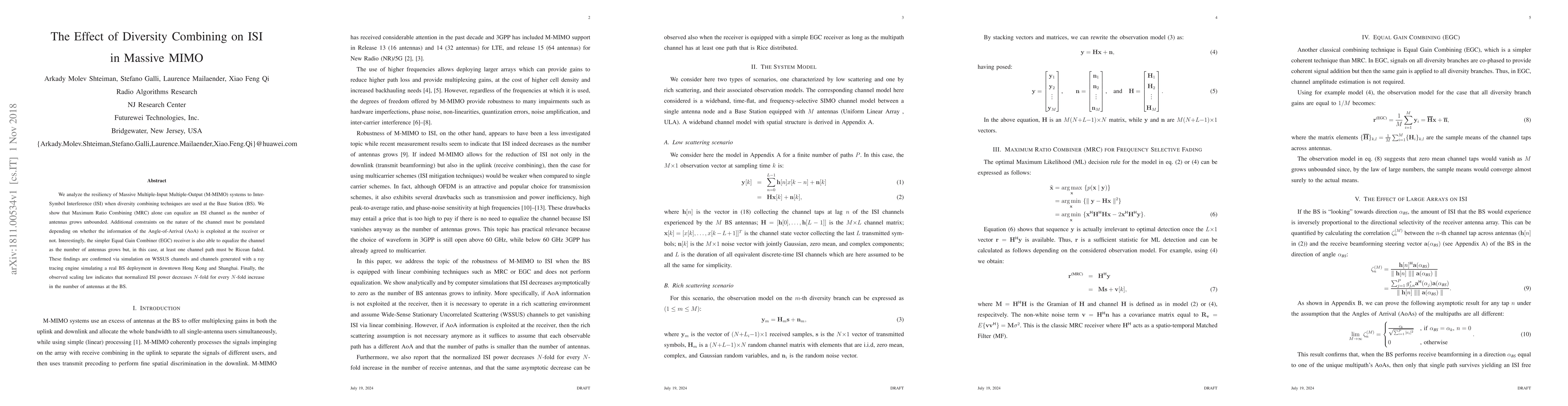 This paper explores how diversity combining techniques in Massive MIMO systems mitigate Inter-Symbol Interference (ISI), demonstrating that Maximum Ratio Combining (MRC) and Equal Gain Combining (EGC) can effectively equalize ISI channels as the number of antennas increases, with specific channel conditions affecting performance. Simulation results confirm these findings across different urban environments.
