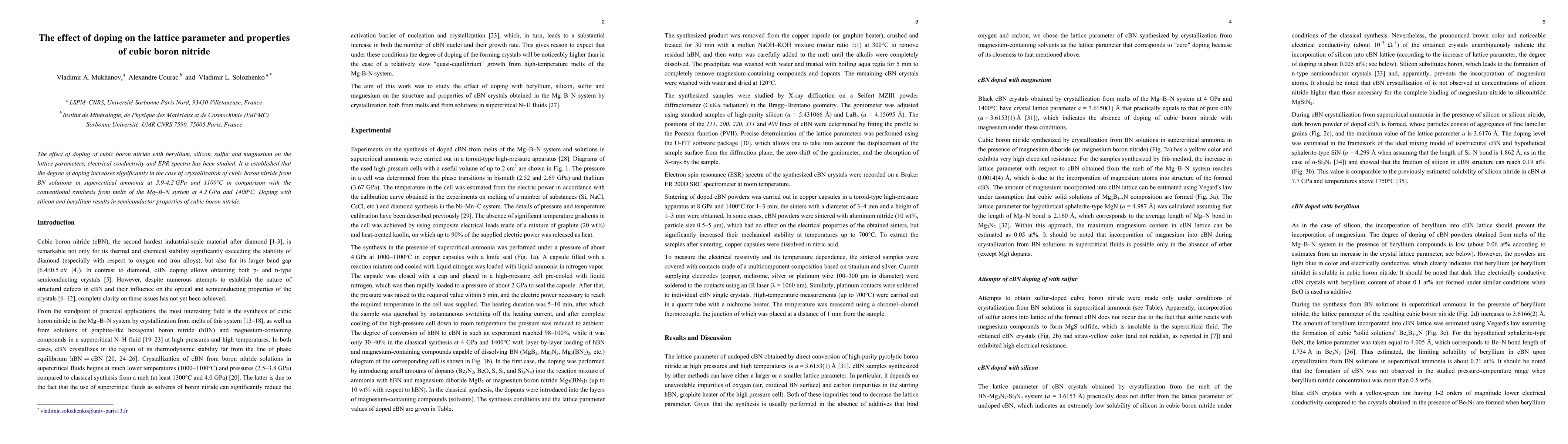 This study investigates the impact of doping cubic boron nitride with beryllium, silicon, sulfur, and magnesium on its lattice parameters, electrical conductivity, and EPR spectra. It finds that doping is more effective when synthesized from BN solutions in supercritical ammonia compared to conventional melt synthesis, with silicon and beryllium doping leading to semiconductor properties.