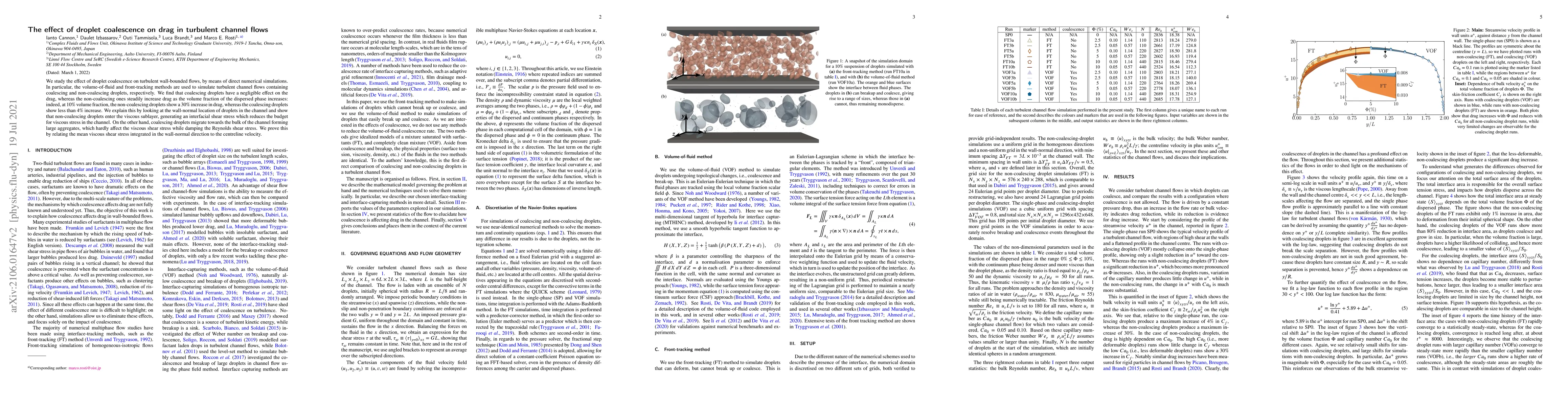 This study uses direct numerical simulations to investigate how droplet coalescence affects drag in turbulent channel flows. Non-coalescing droplets significantly increase drag, especially at higher volume fractions, due to their entry into the viscous sublayer, while coalescing droplets have a minimal impact on drag, primarily due to their aggregation in the channel's bulk.