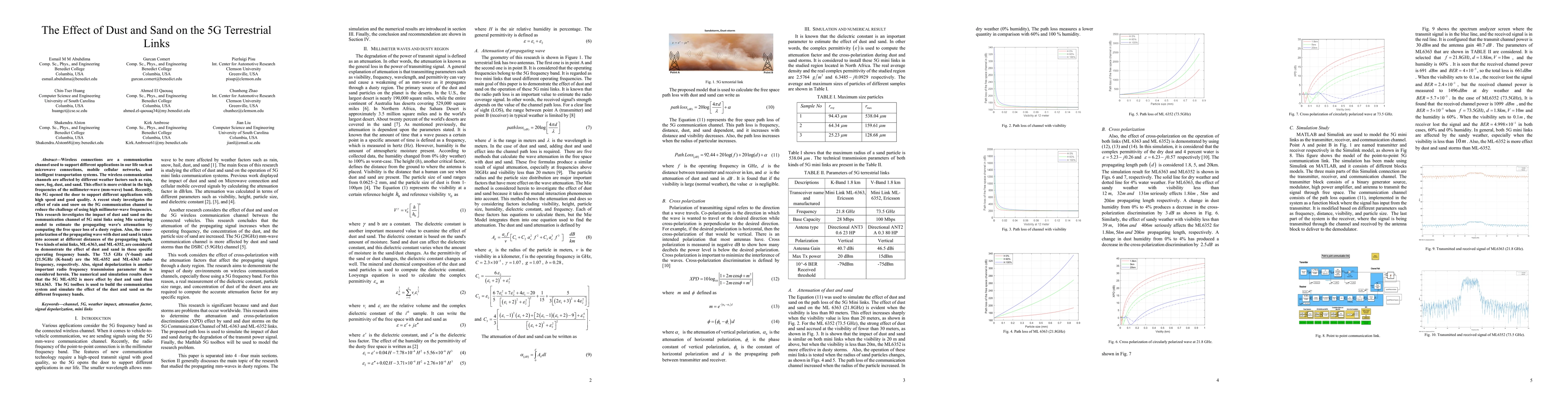 Wireless connections are a communication channel used to support different applications in our life such as microwave connections, mobile cellular networks, and intelligent transportation systems. The wireless communication channels are affected by different weather factors such as rain, snow, fog, dust, and sand. This effect is more evident in the high frequencies of the millimeter-wave (mm-wave) band. Recently, the 5G opened the door to support different applications with high speed and good quality. A recent study investigates the effect of rain and snow on the 5G communication channel to reduce the challenge of using high millimeter-wave frequencies. This research investigates the impact of dust and sand on the communication channel of 5G mini links using Mie scattering model to estimate the propagating wave's attenuation by computing the free space loss of a dusty region. Also, the cross-polarization of the propagating wave with dust and sand is taken into account at different distances of the propagating length. Two kinds of mini links, ML-6363, and ML-6352, are considered to demonstrate the effect of dust and sand in these specific operating frequency bands. The 73.5 GHz (V-band) and (21.5GHz (K-band) are the ML-6352 and ML-6363 radio frequency, respectively. Also, signal depolarization is another important radio frequency transmission parameter that is considered heroin. The numerical and simulation results show that the 5G ML-6352 is more effect by dust and sand than ML6363. The 5G toolbox is used to build the communication system and simulate the effect of the dust and sand on the different frequency bands.